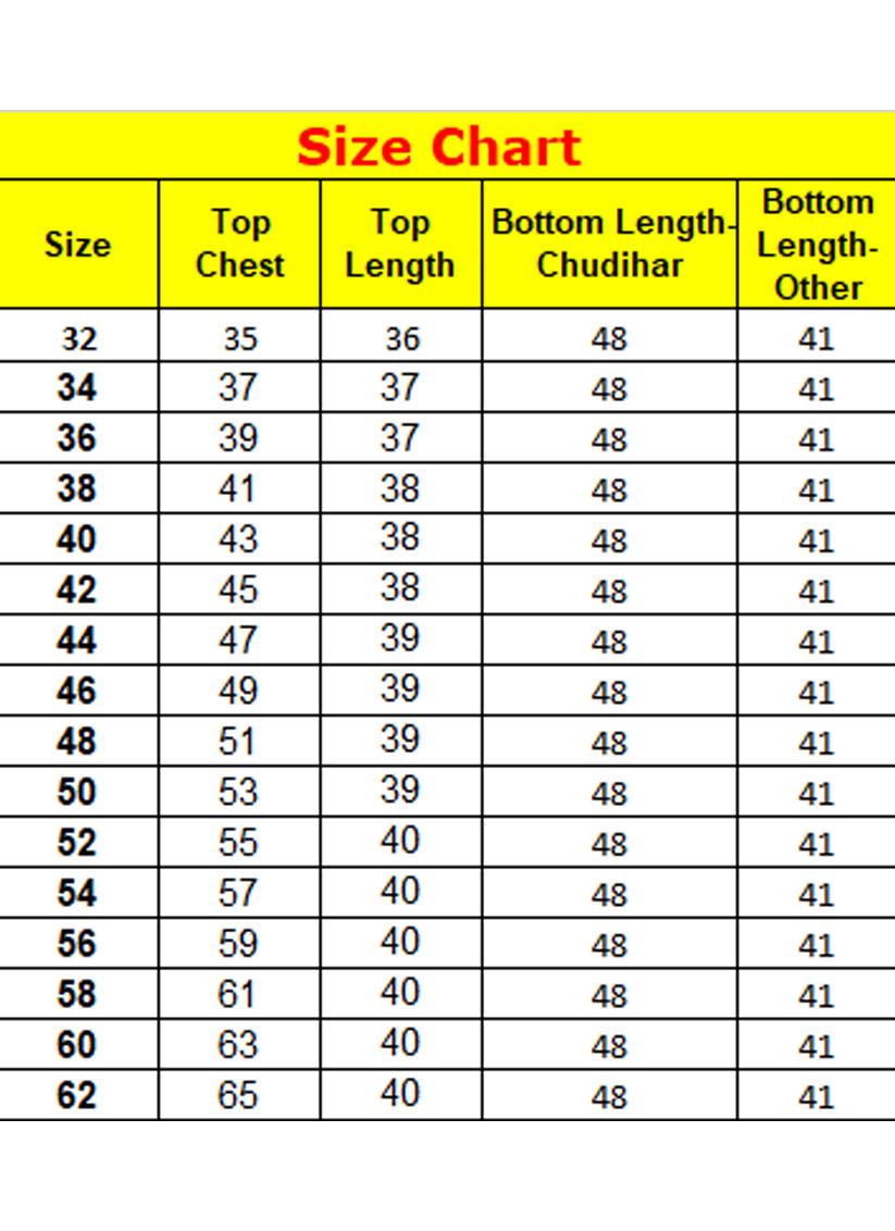 SIZE CHART- Salwar Suits, Kurties, Palazzo Suits, Anarkali Suits, Pant Kameez Set | |||