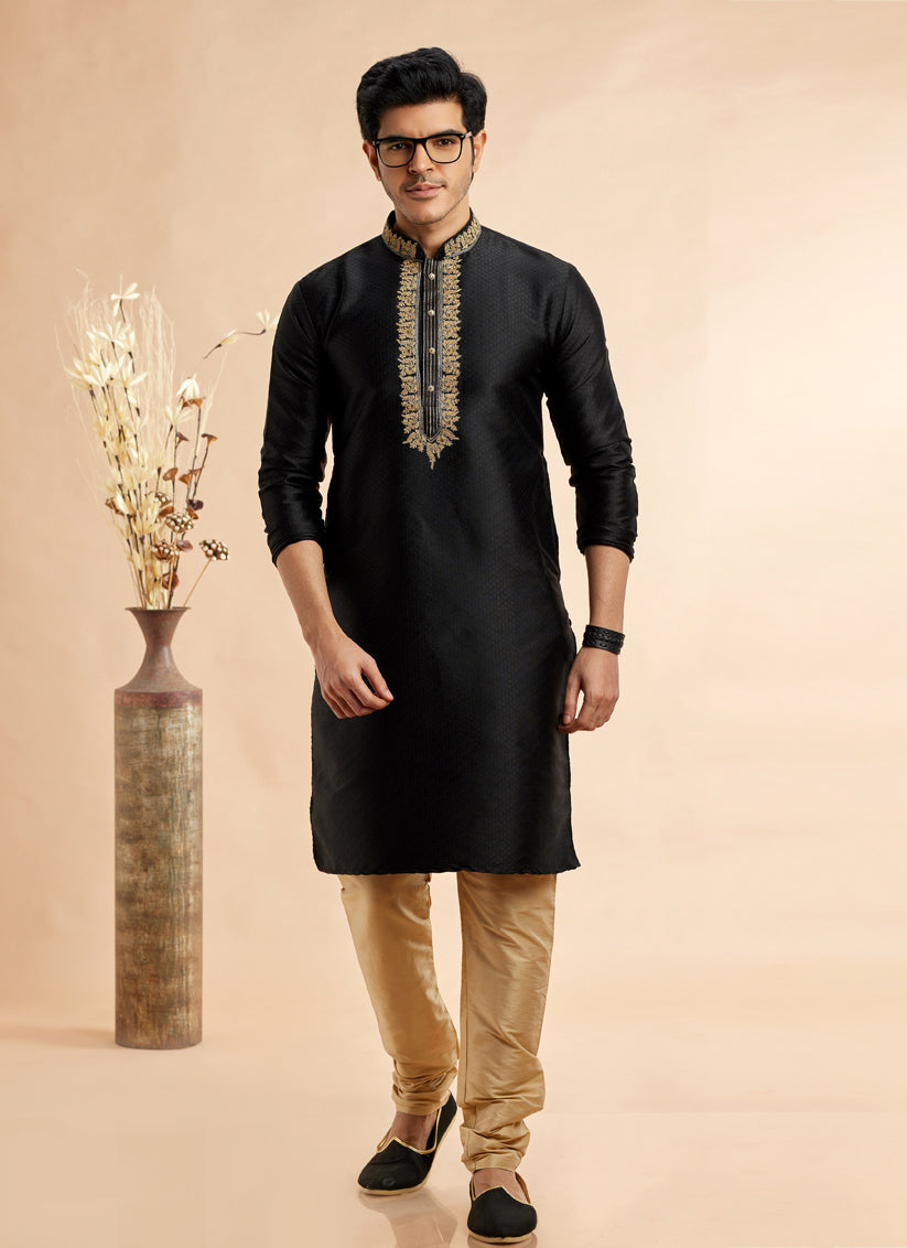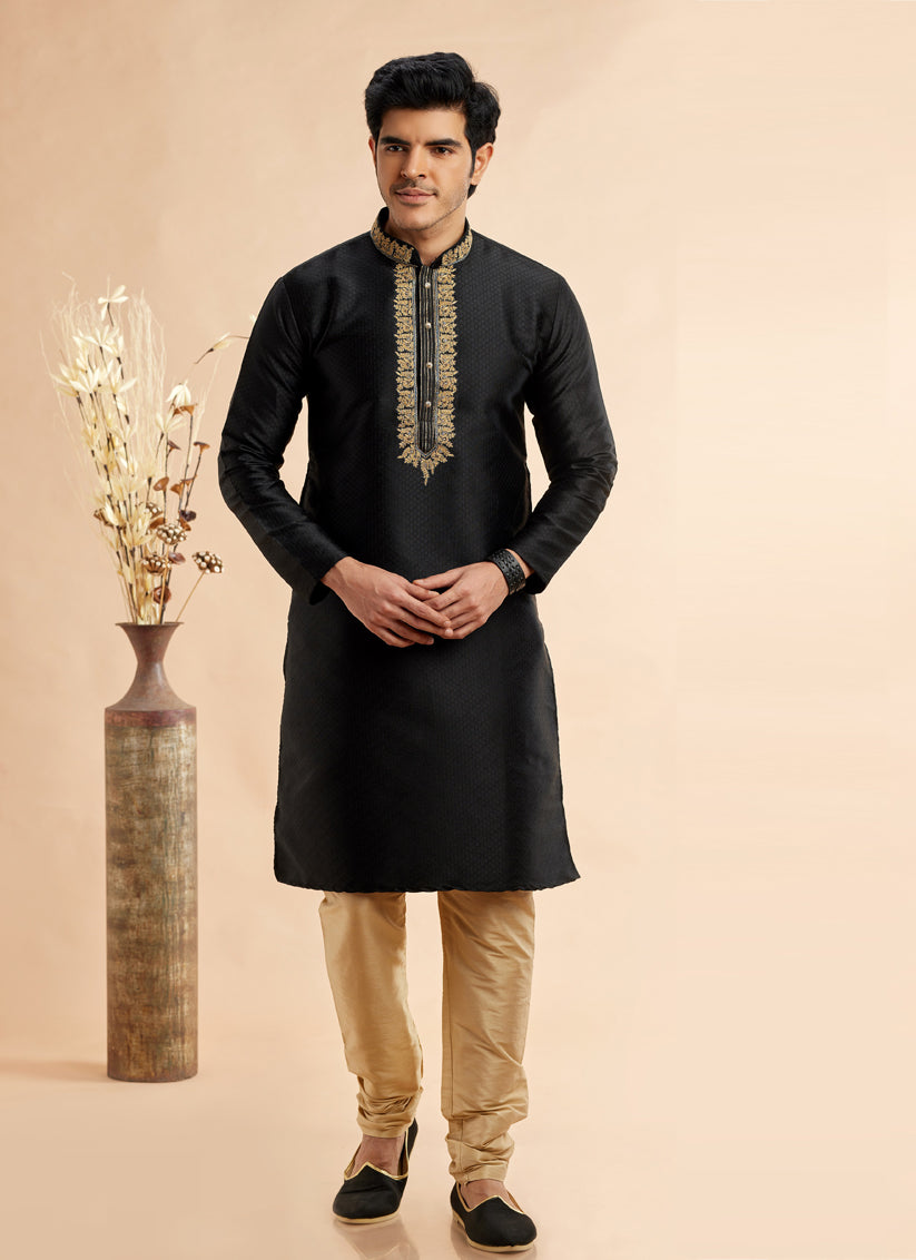 Black Jacquard Art Silk Embroidered Kurta Pajama Set