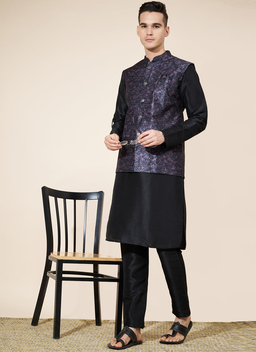 Black Silk Mens Kurta Pajama Set with Jacquard Jacket