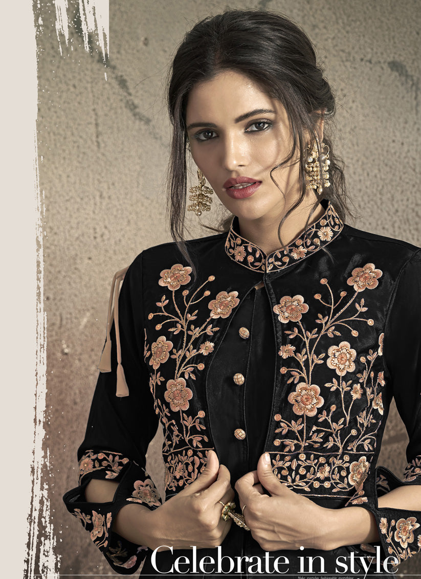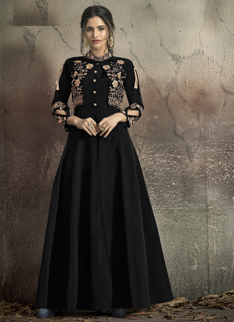 TDO25800-1Black Taffeta Silk Embroidered Party Wear Gown