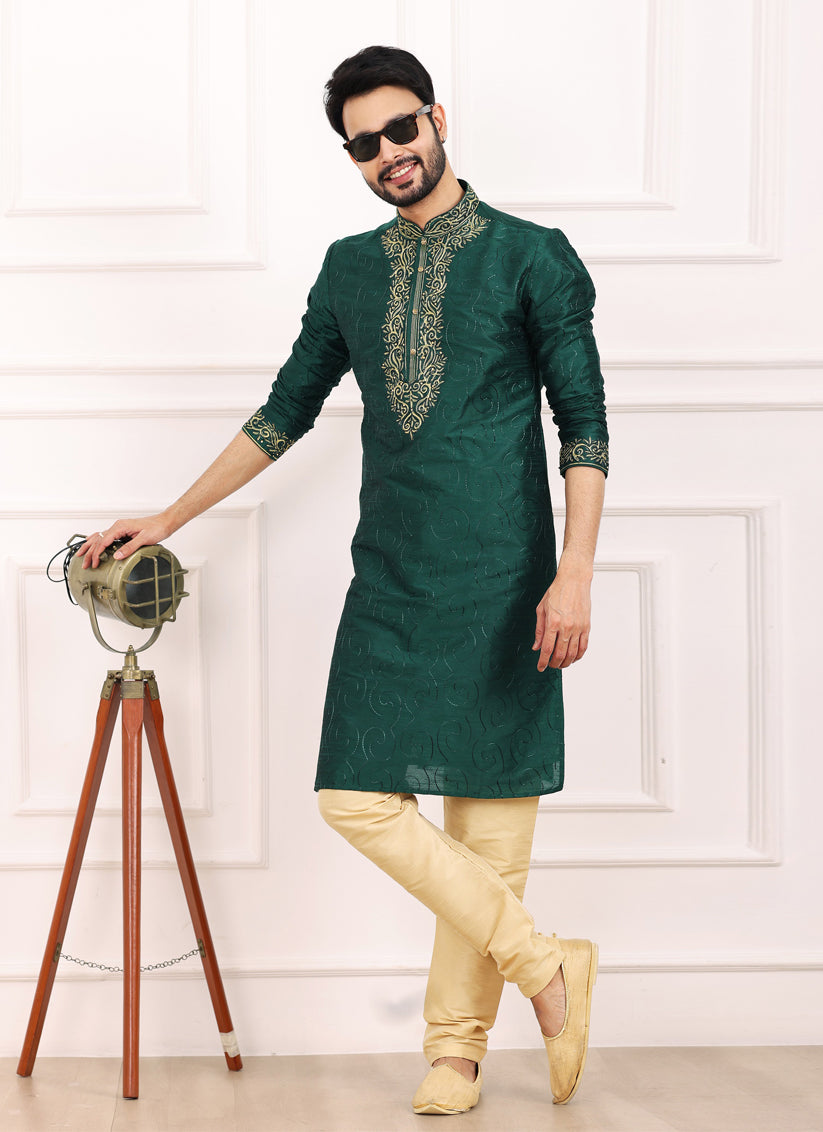 TDO157405-1Bottle Green Banarasi Silk Thread Work Kurta Set