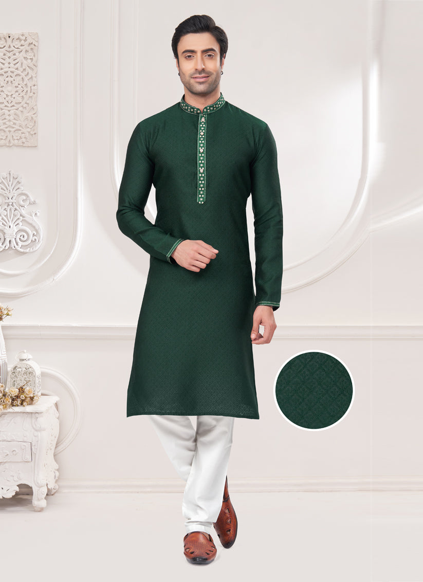 Bottle Green Jacquard Mens Kurta Pajama Set