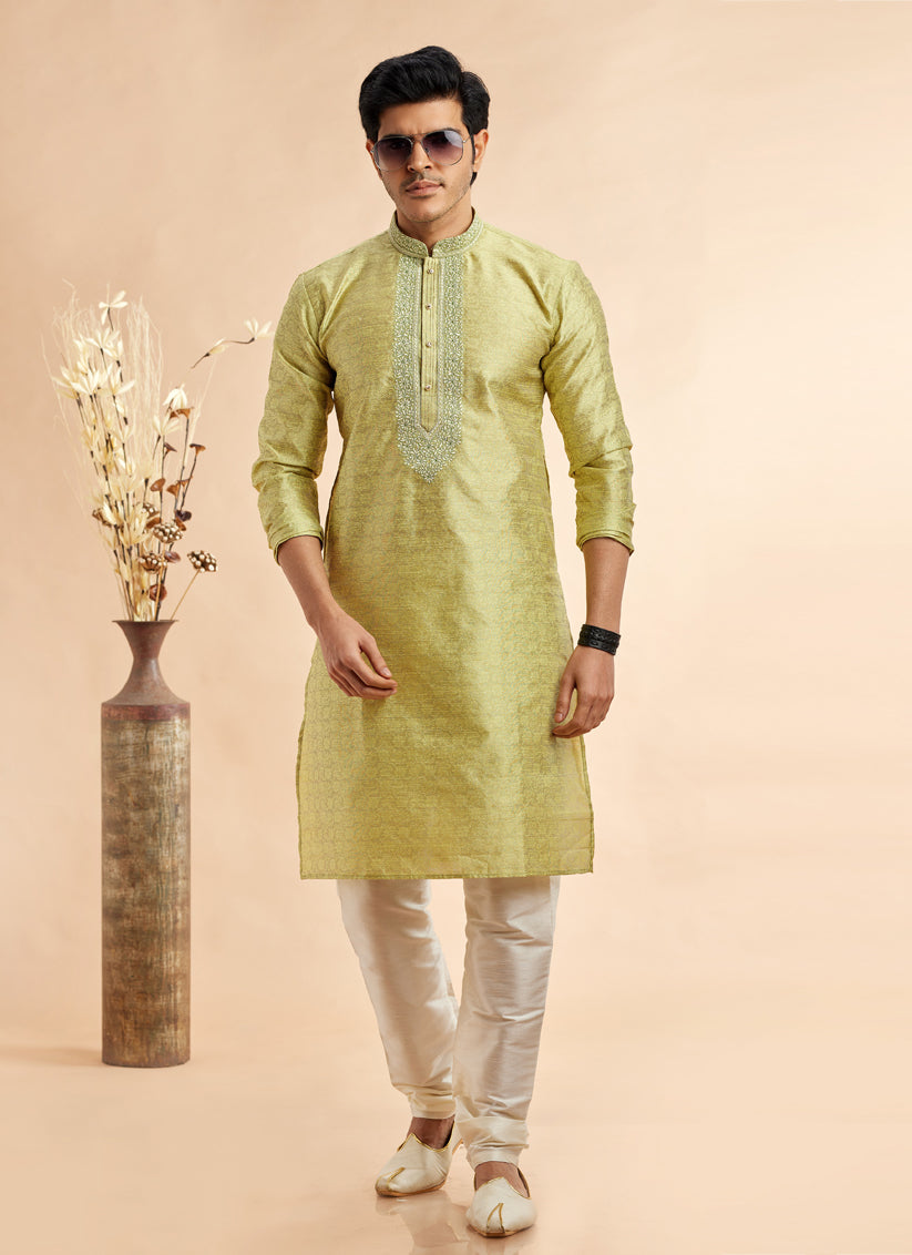 Chartreuse Green Jacquard Art Silk Embroidered Kurta Pajama Set