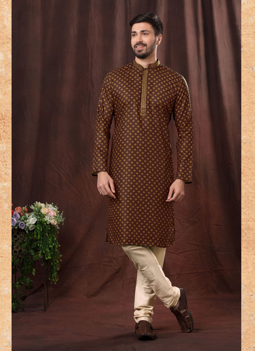 Chocolate Brown Polyester Printed Kurta Pyjama Set