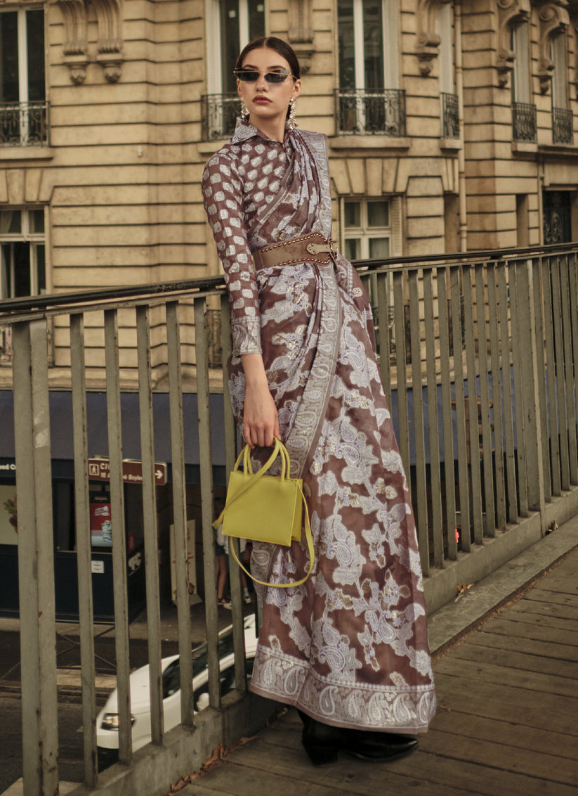 Coffee Brown Organza Lucknowi Handloom Weaving Saree