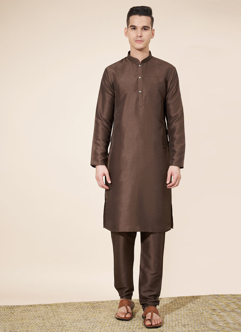 Coffee Brown Silk Solid Mens Kurta Pajama Set