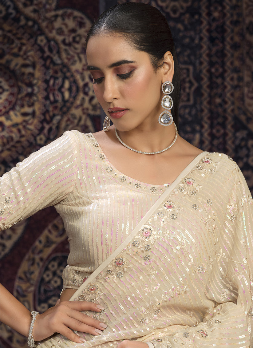 Cream Georgette Sequins Work Wedding Saree