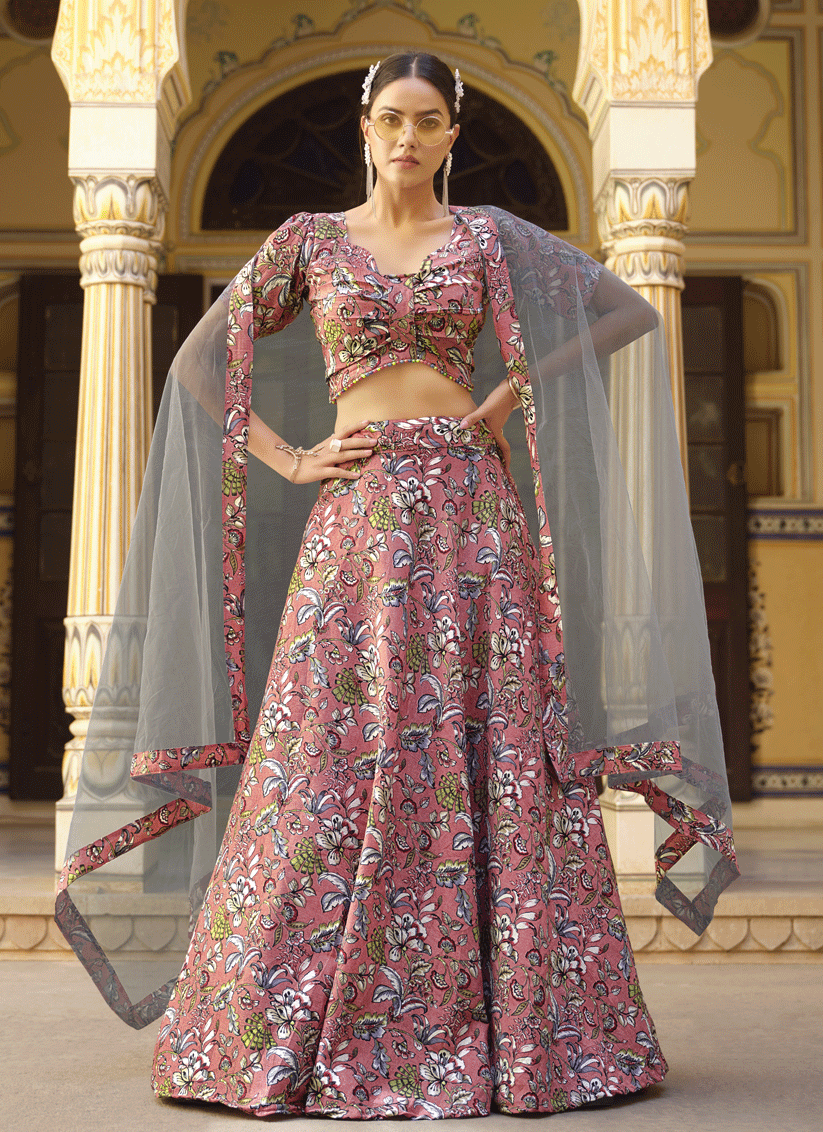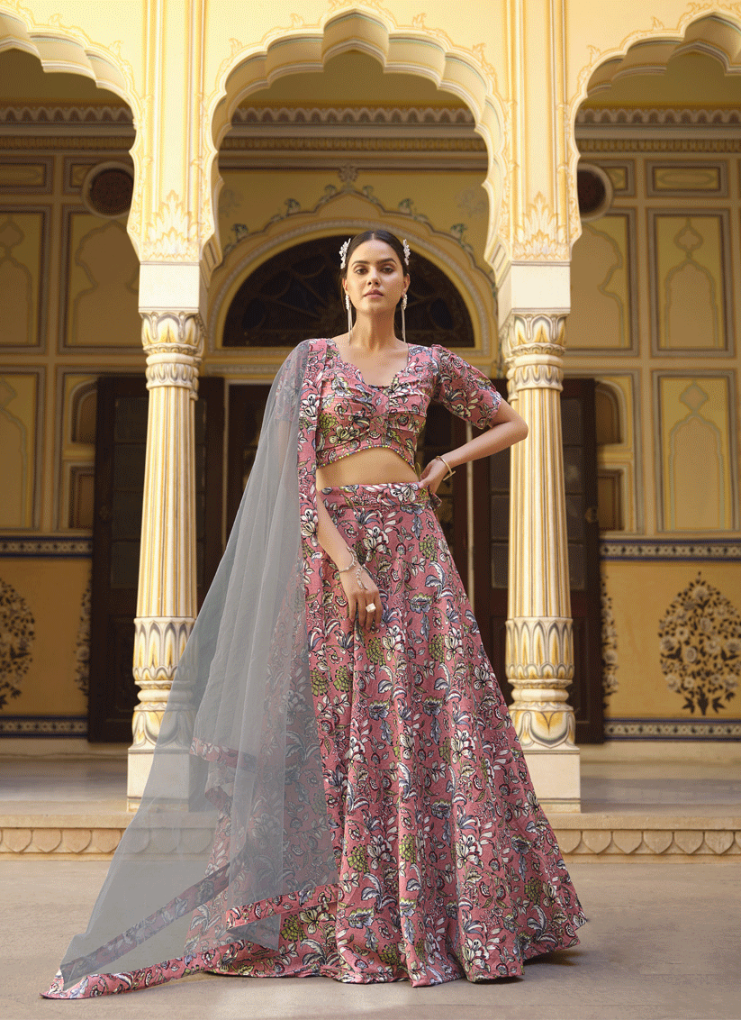 Dusty Pink Silk Floral Printed Lehenga Choli