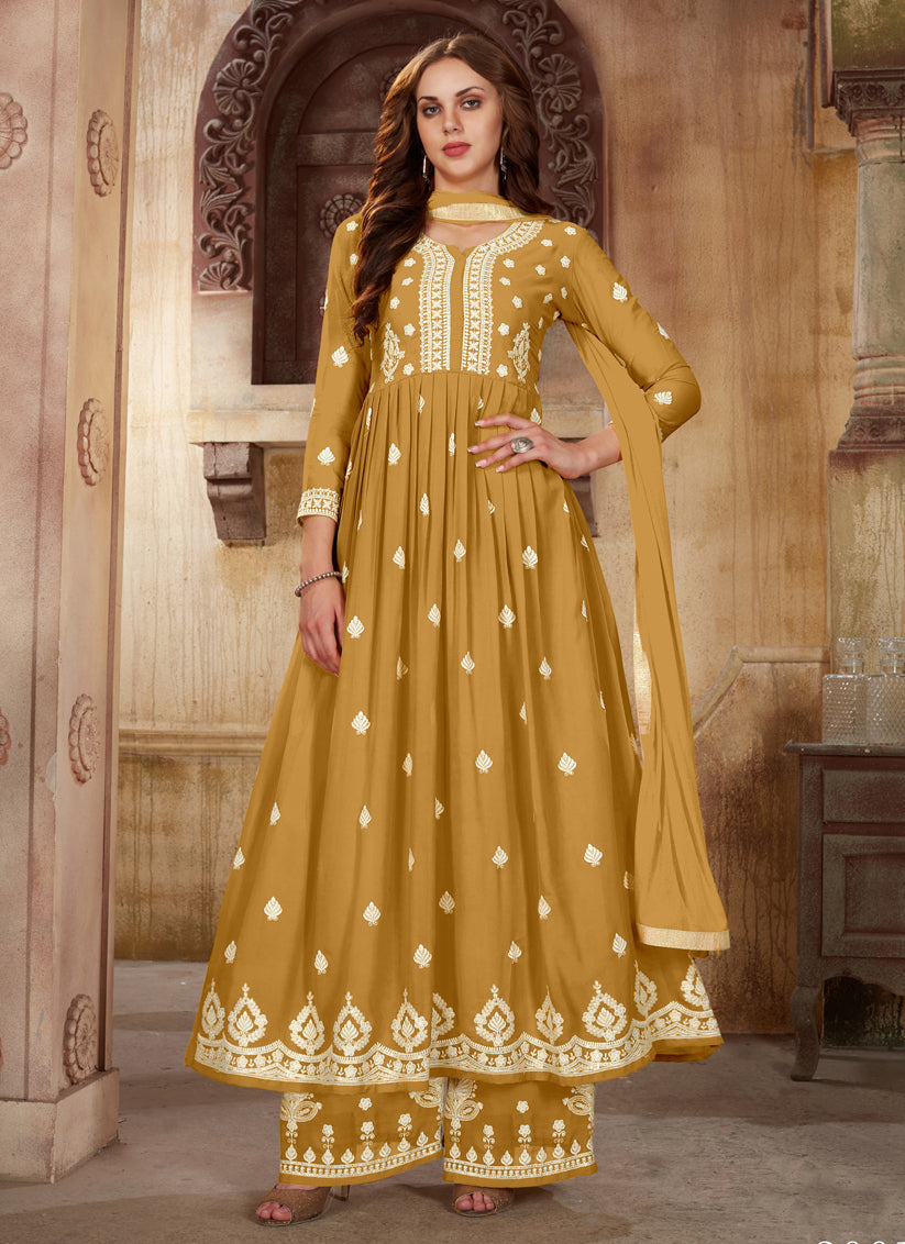 Fawn Faux Georgette Embroidered Ready Made Palazzo Kameez