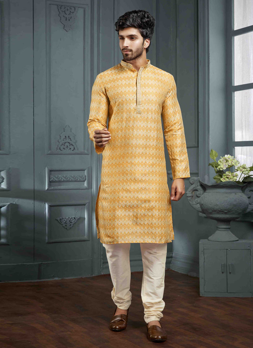 Golden Yellow Jacquard Mens Kurta Pajama Set