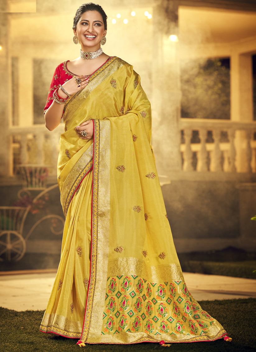 TDO45205-ReadyLamon Yellow Silk Embroidered Wedding Saree