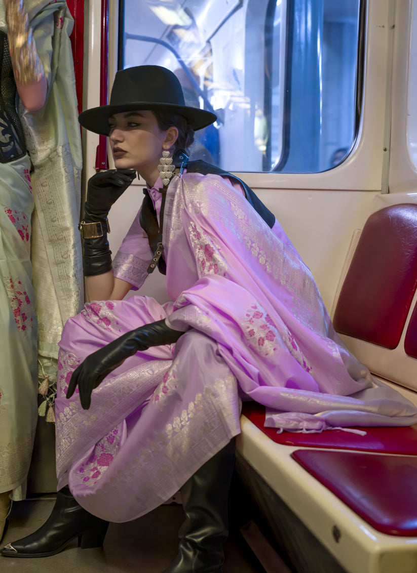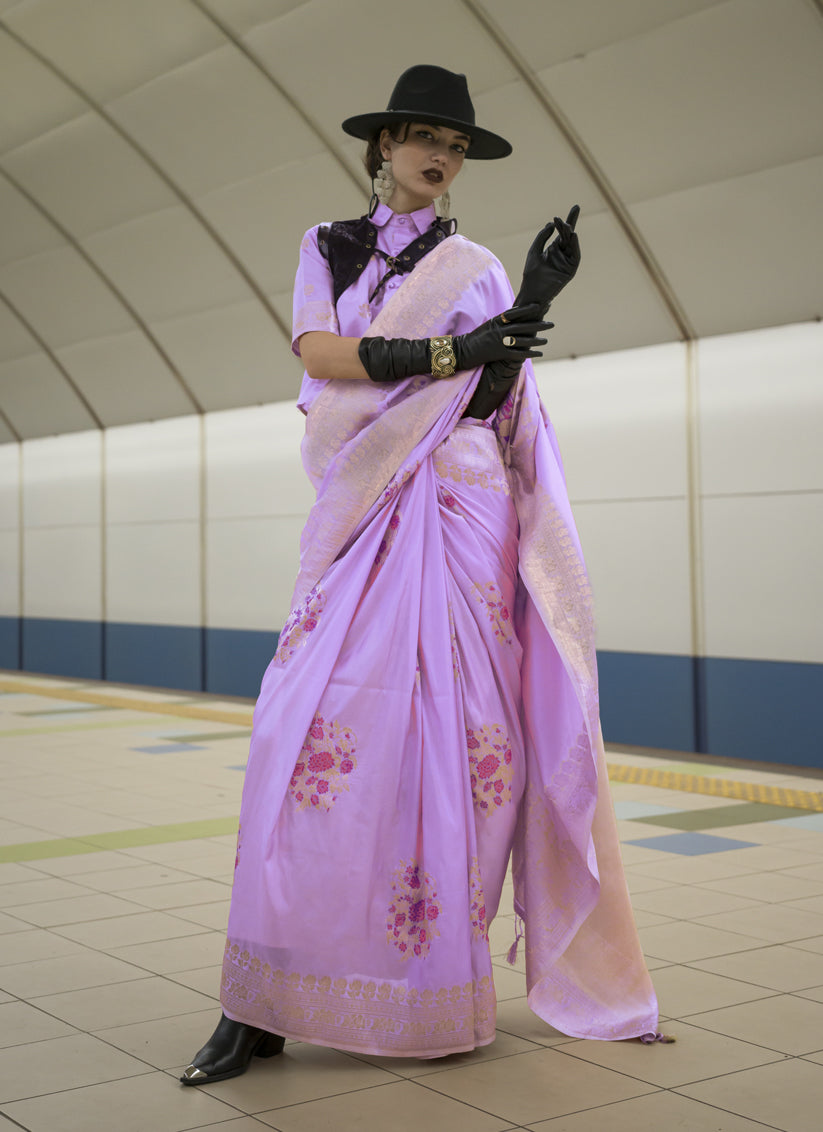 Lilac Pink Habutai Silk Handloom Weaving Saree