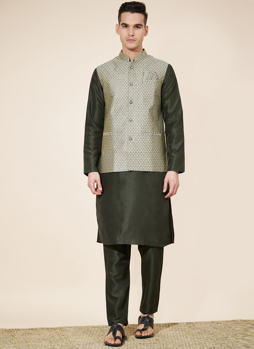 Mehendi Green Silk Mens Kurta Pajama Set with Jacquard Jacket