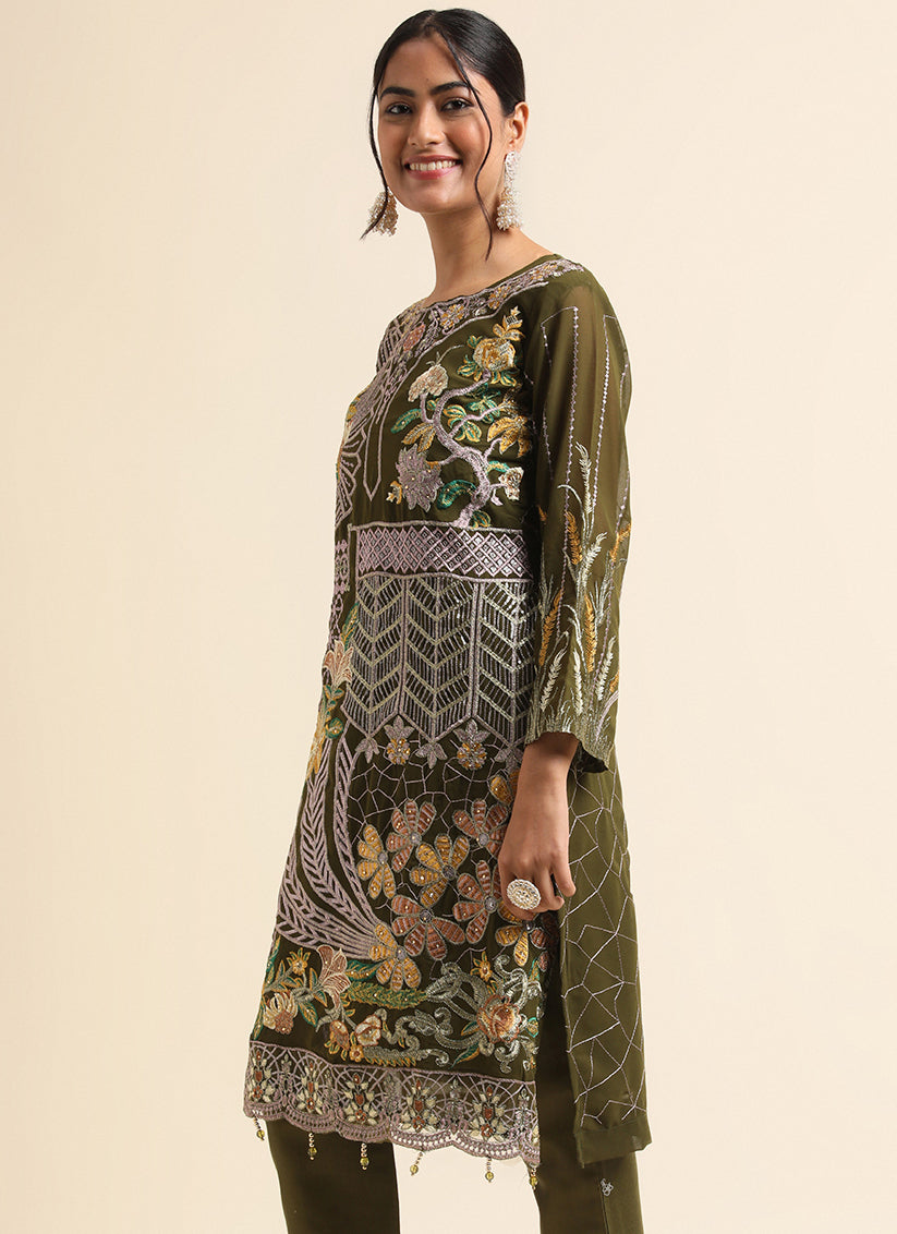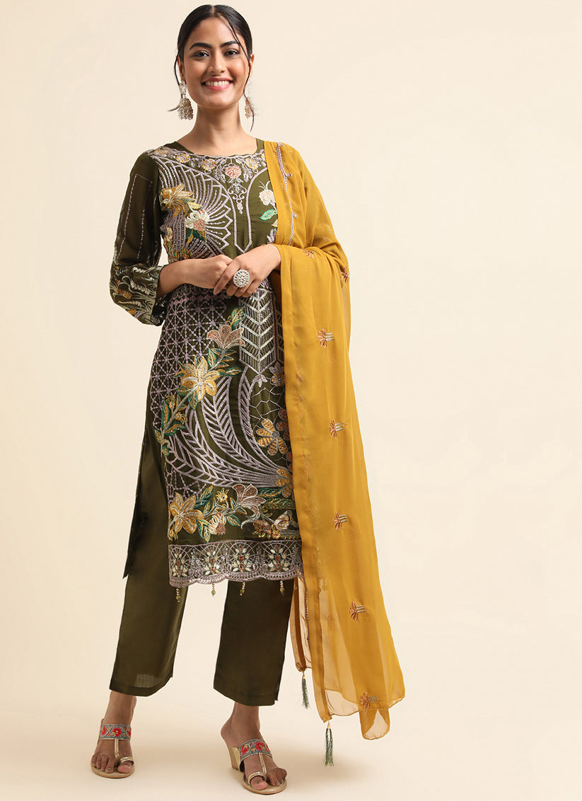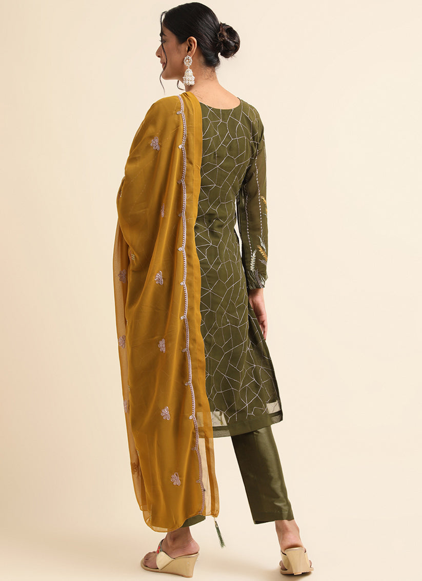 Mehndi Green Faux Georgette Embroidered Pant Kameez Suit