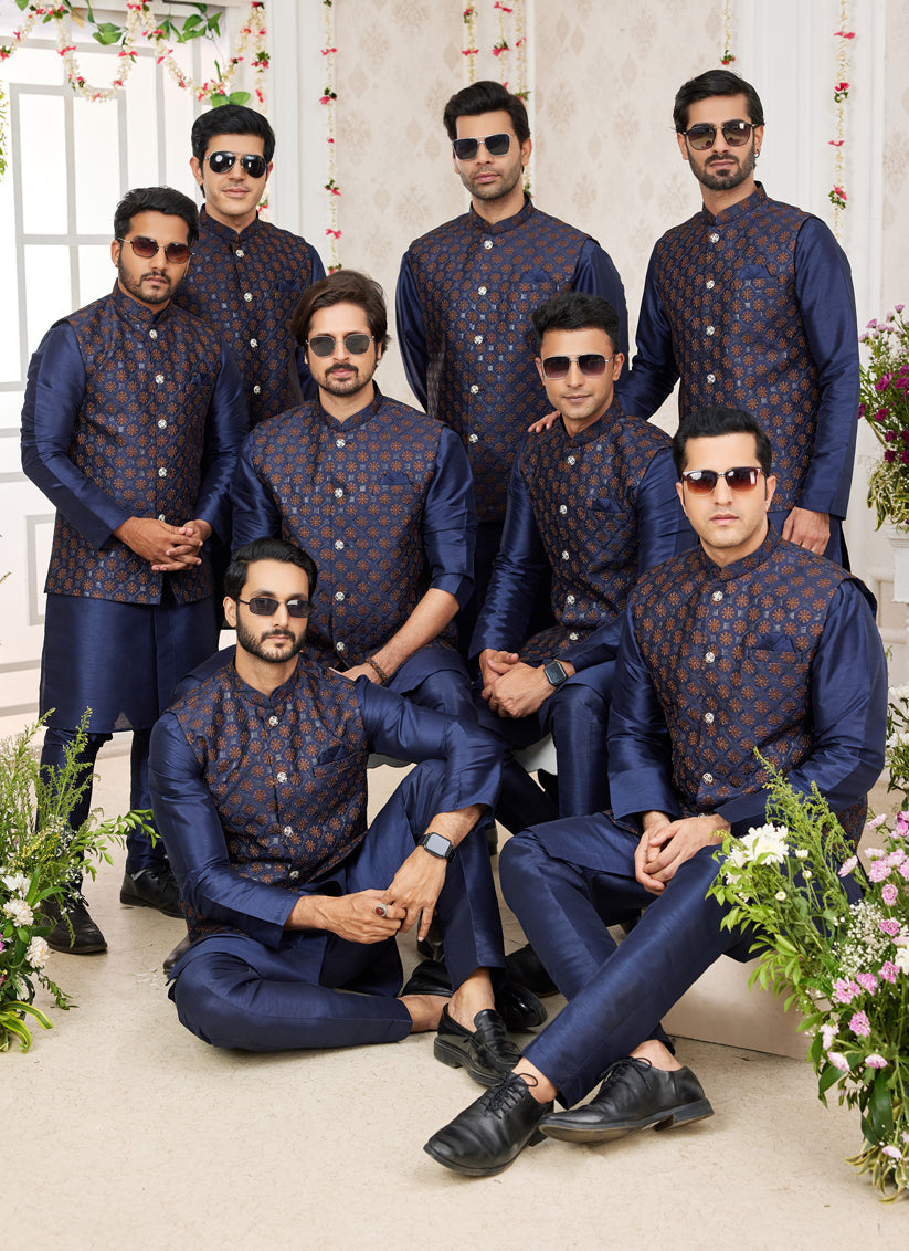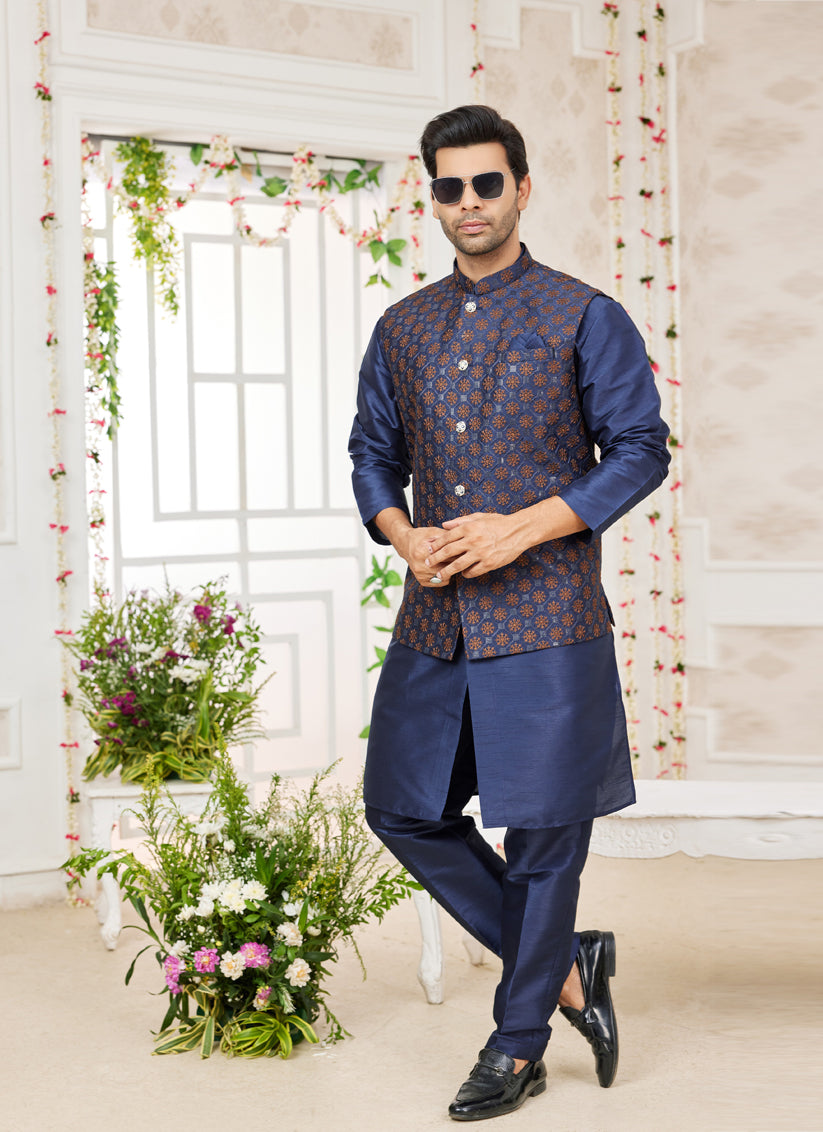 Midnight Blue Art Banarasi Silk Mens Kurta Pajama Set With Jacket