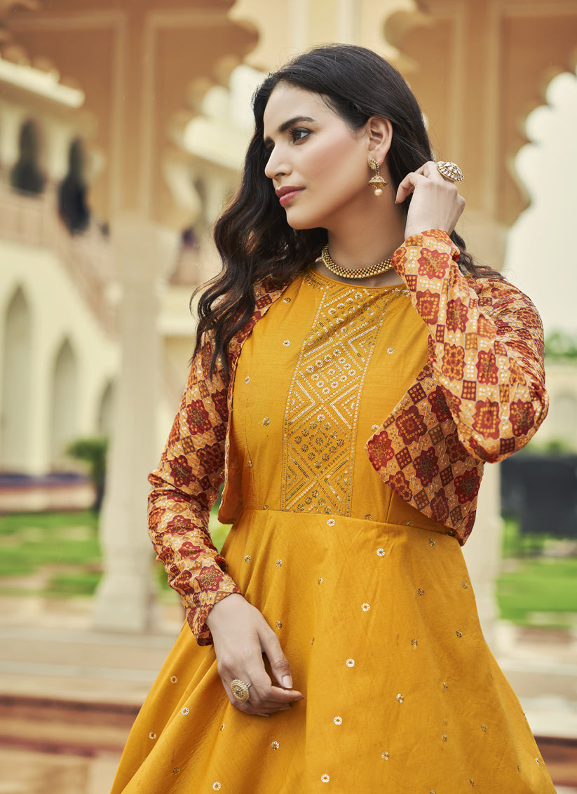Mustard Yellow Cotton Embroidered Gown with Jacket
