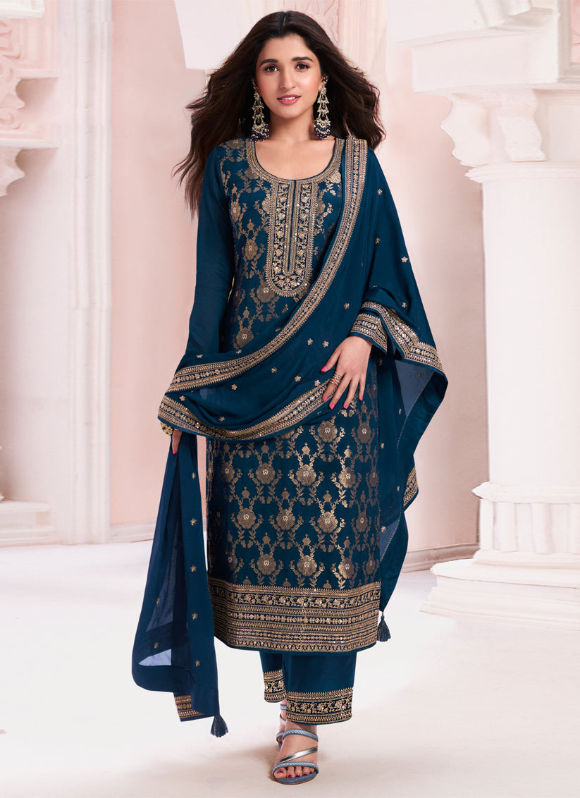 Nidhi Shah Prussian Blue Chinnon Embroidered Pant Kameez