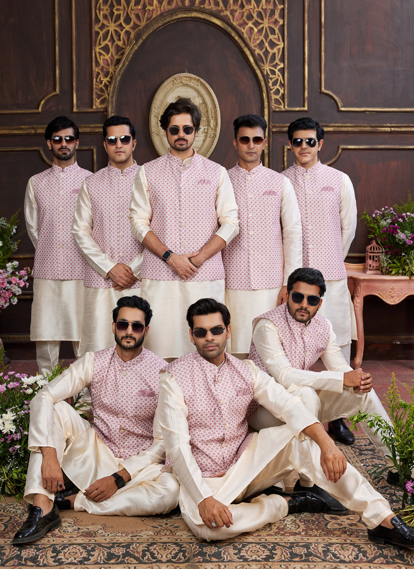 Off White Art Banarasi Silk Mens Kurta Pajama Set With Jacket