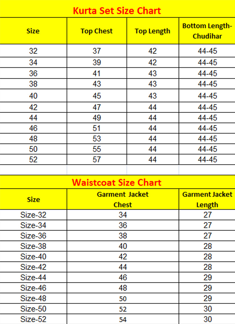 Men's Wears - Kurta, Sherwani, Jodhpuri etc(Size Chart)