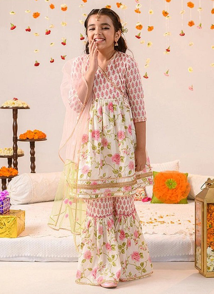 Off White Floral Print Girls Kurta with Sharara and Duptta