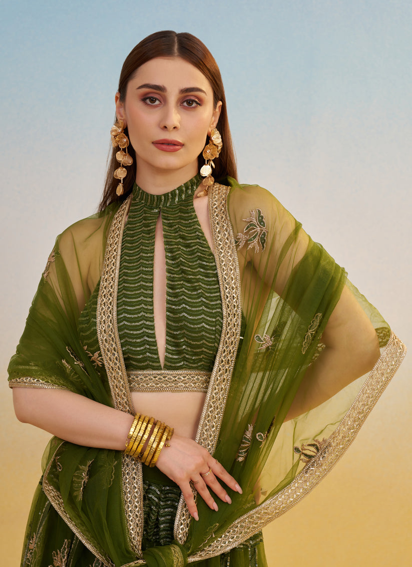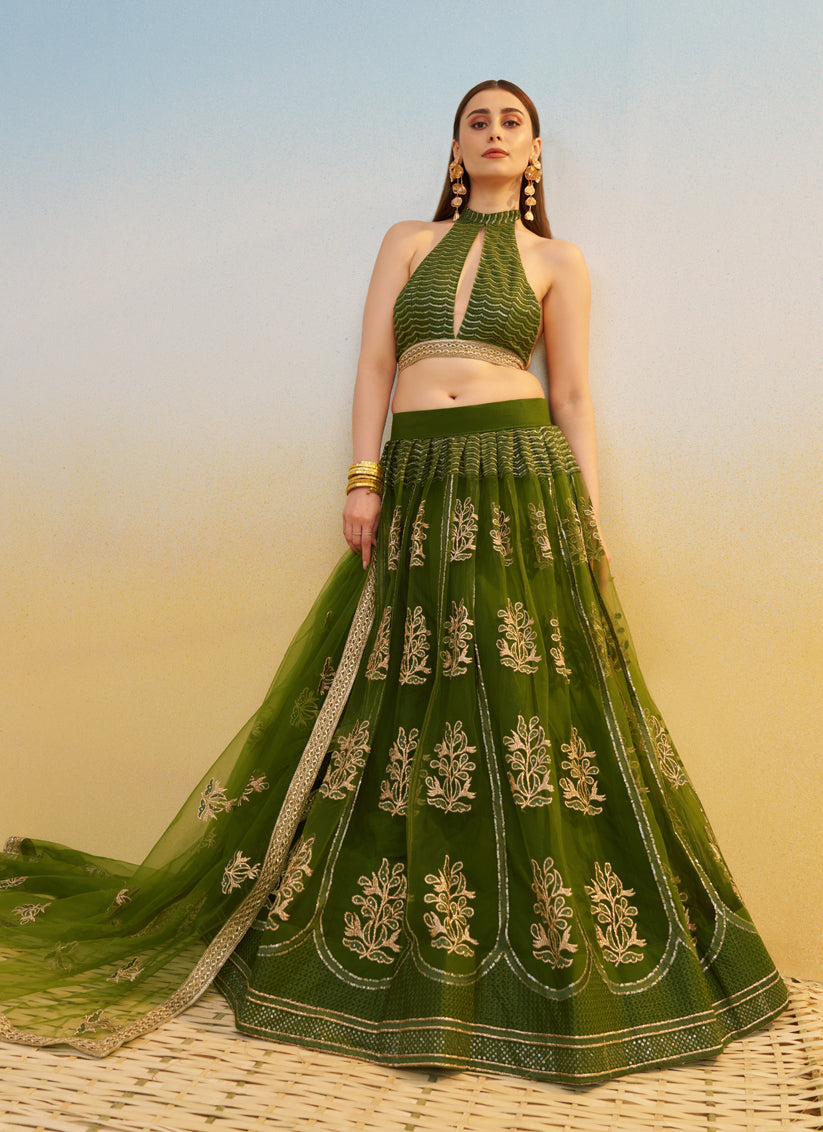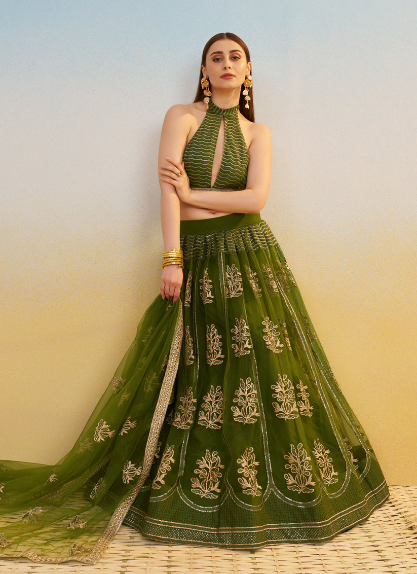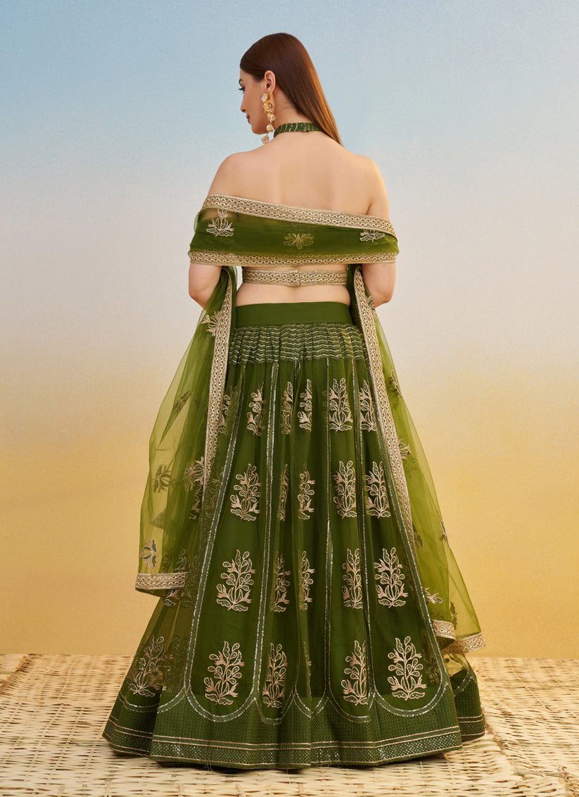 Olive Green Net Designer Embroidered Lehenga Choli Set