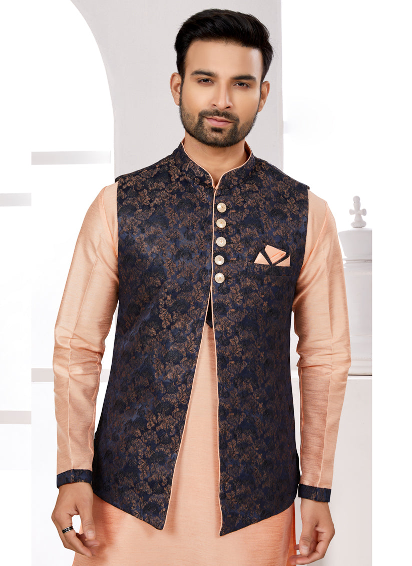 Peach Kurta Pyjama Set with Navy Blue Jacket