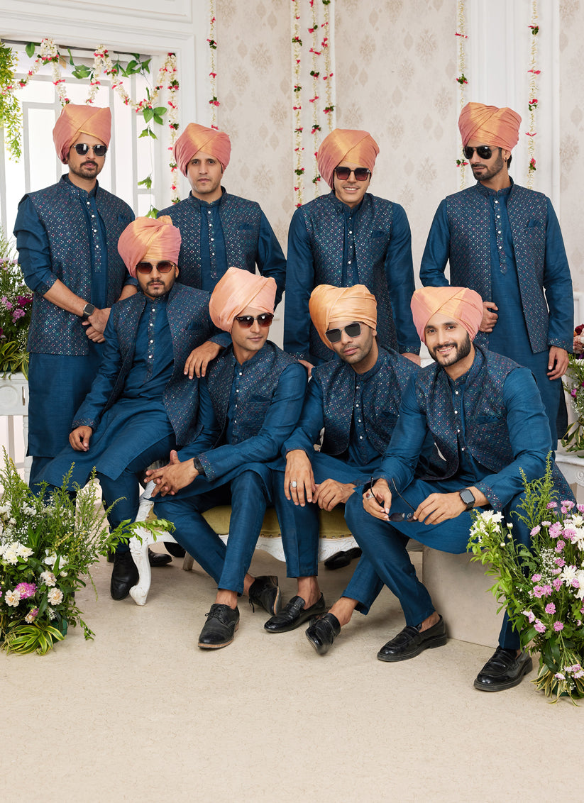 TDO251005-1Peacock Blue Art Banarasi Silk Mens Kurta Pajama Set With Jacket