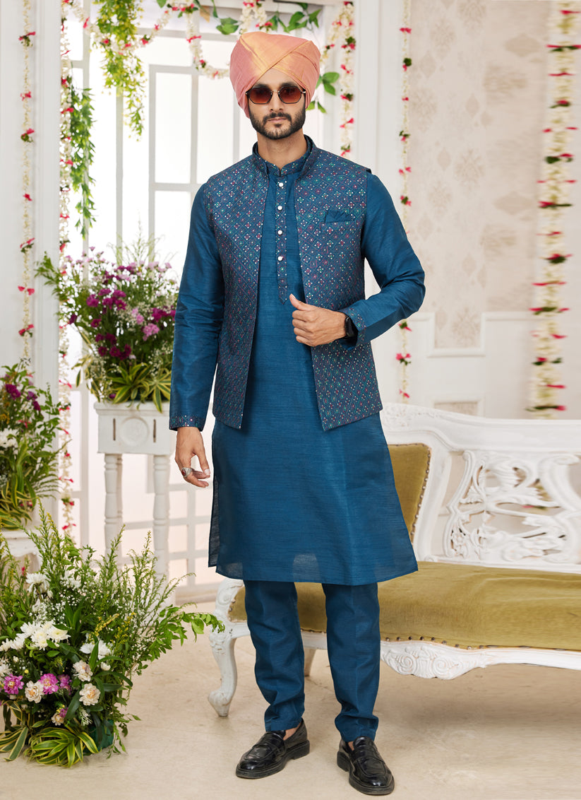Peacock Blue Art Banarasi Silk Mens Kurta Pajama Set With Jacket