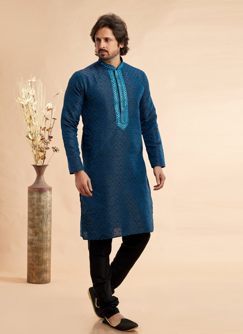 Peacock Blue Jacquard Art Silk Embroidered Kurta Pajama Set