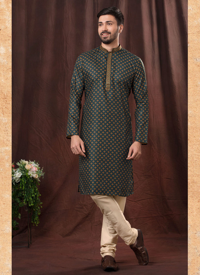 Peacock Blue Polyester Printed Kurta Pyjama Set