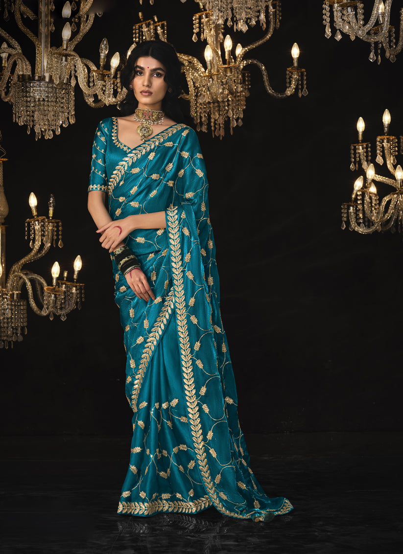 Peacock Blue Tissue Silk Embroidered Designer Saree
