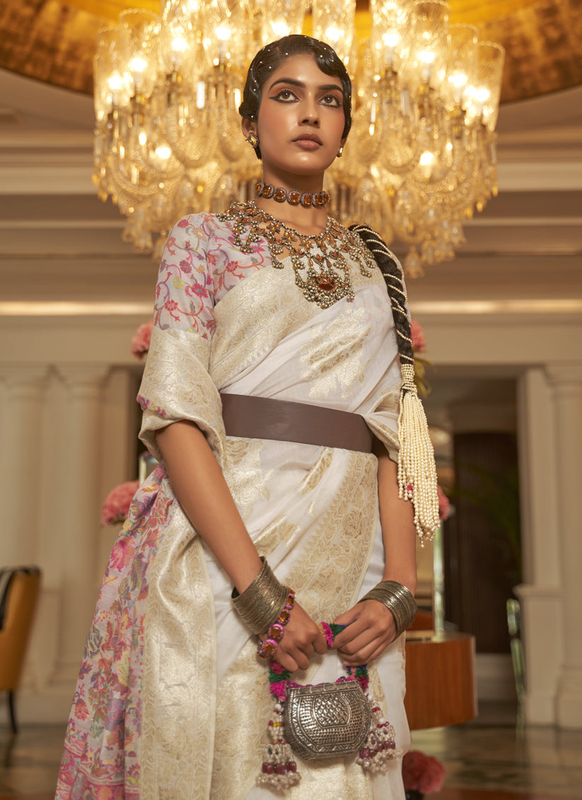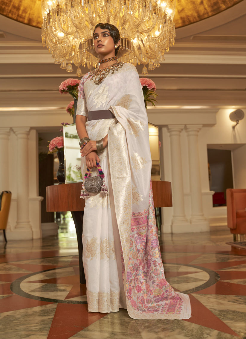 Pearl White Modal Kashmiri Pallu Saree For Festival