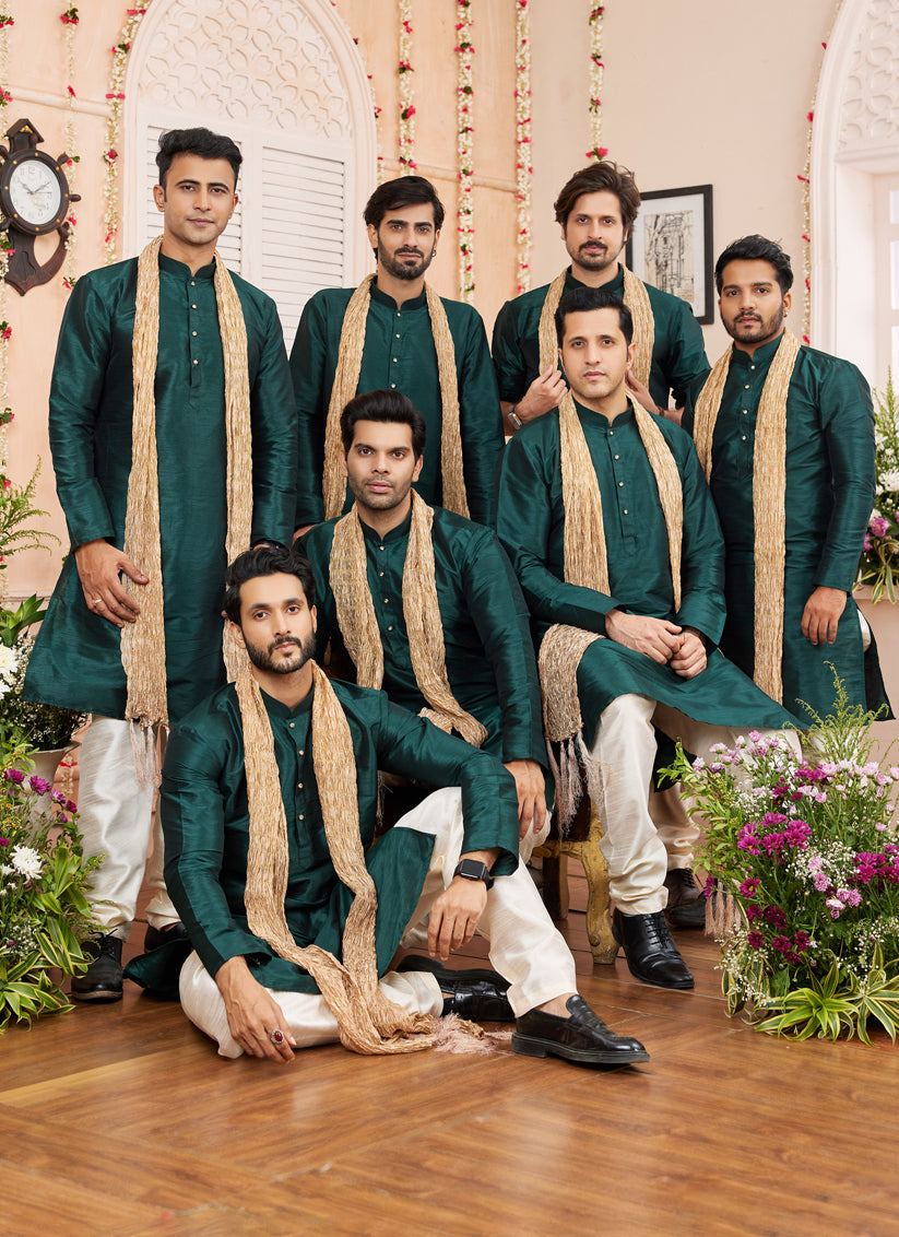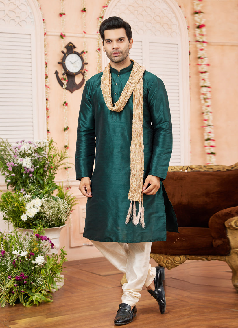 Pine Green Art Silk Mens Kurta Pajama Set With Stole