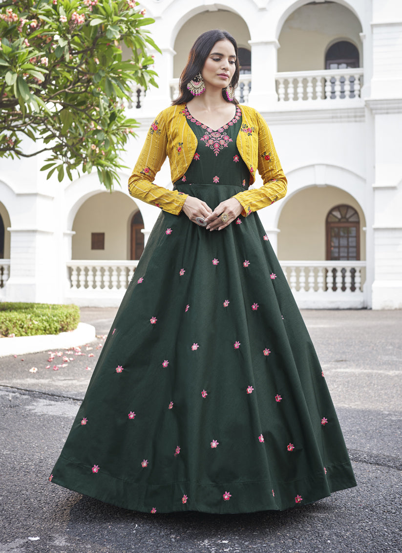TDO74800-1Pine Green Cotton Embroidered Gown with Jacket