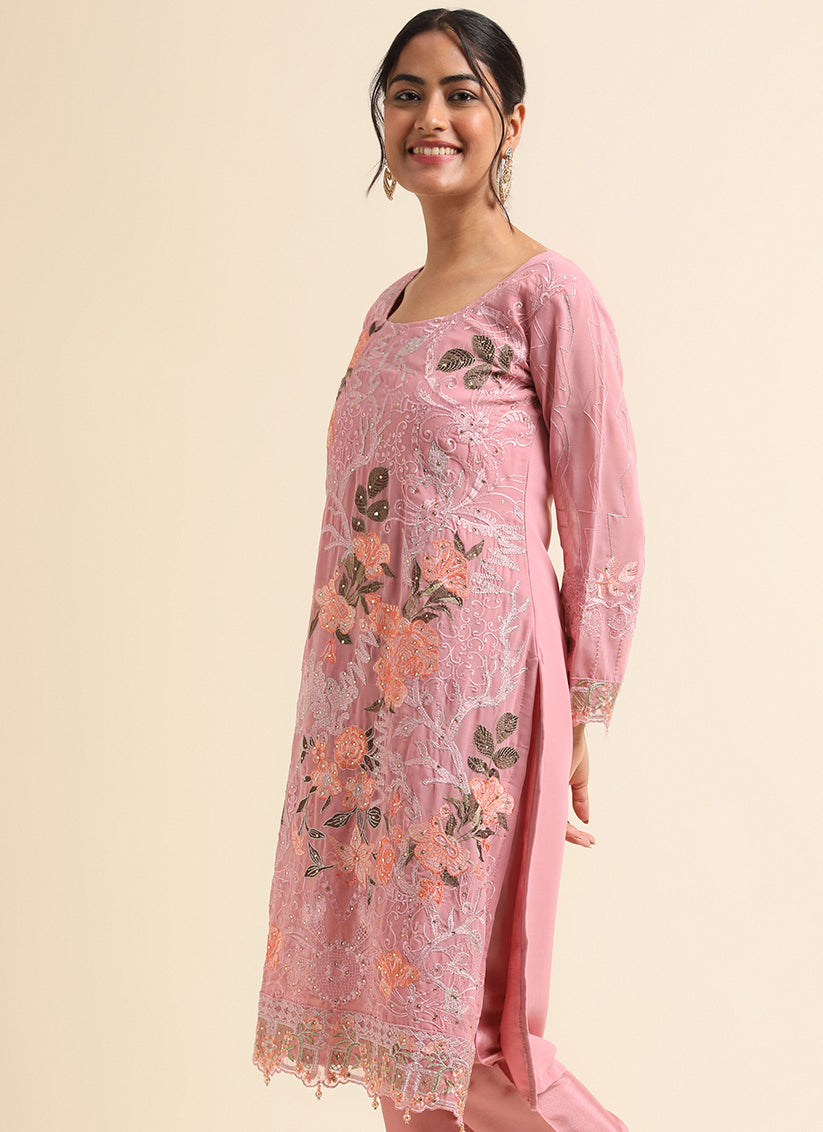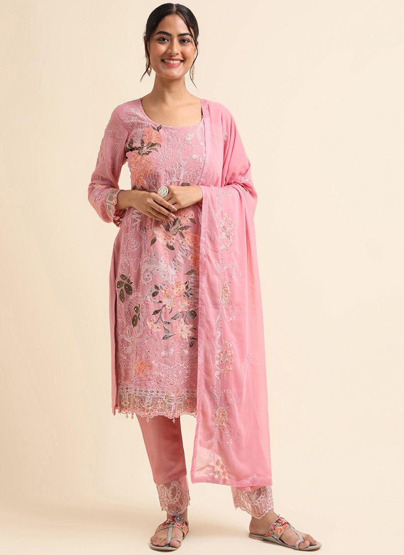 Pink Faux Georgette Embroidered Pant Kameez Suit