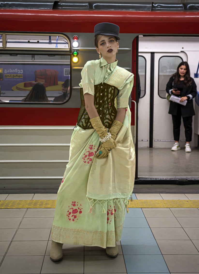 TDO230203-1Pistachio Green Habutai Silk Handloom Weaving Saree