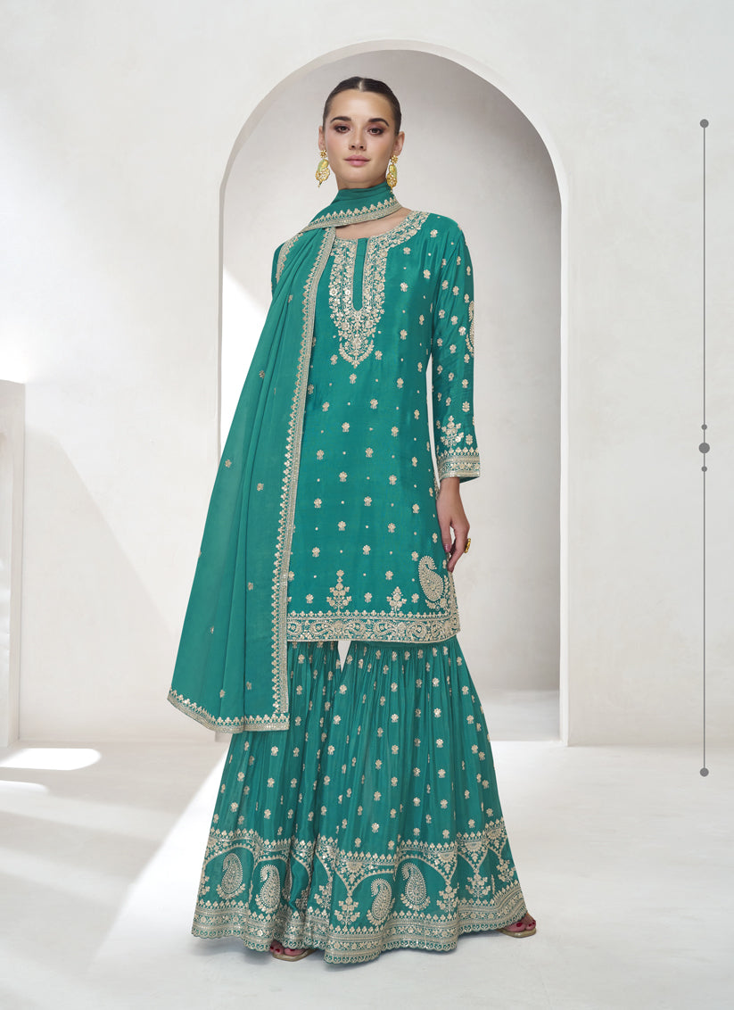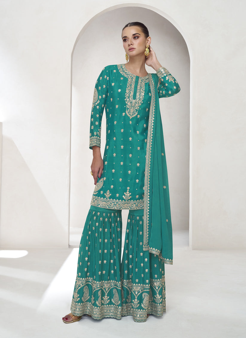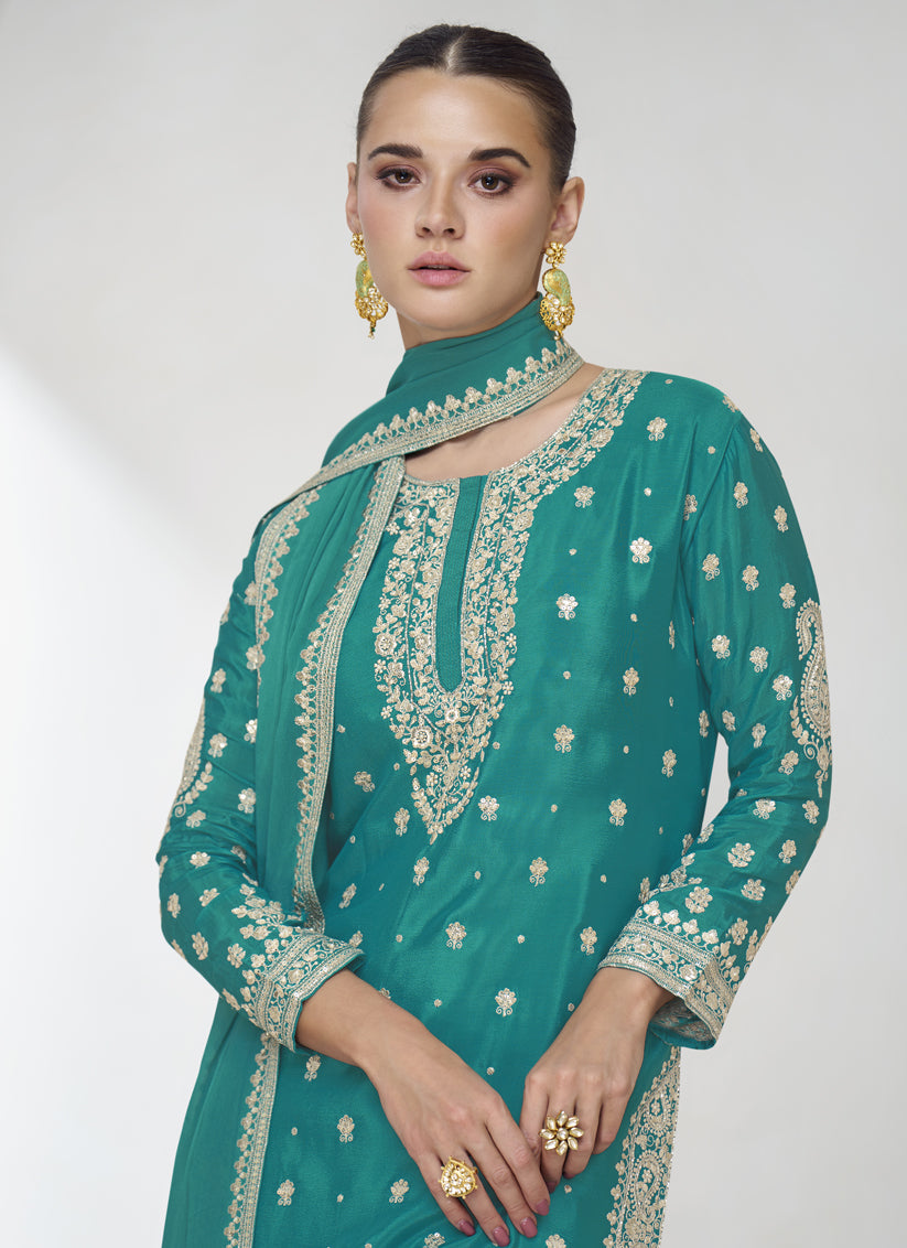 Rama Green Chinnon Silk Designer Sarara Kameez Suit