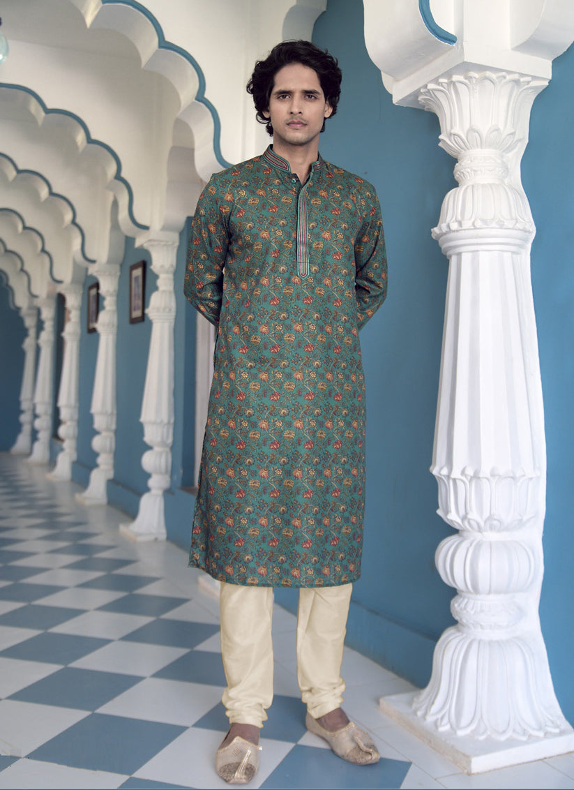 Rama Green Polyester Printed Mens Kurta Pajama Set