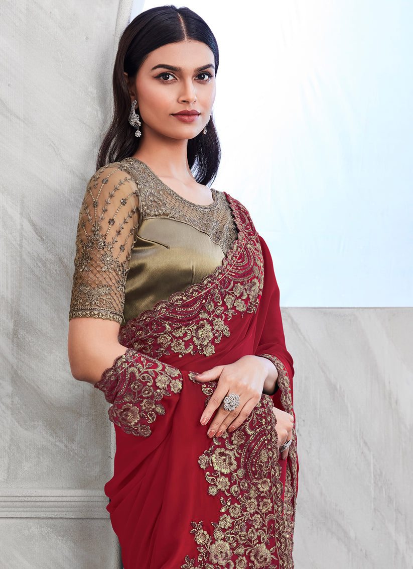 Rust Maroon Silk Designer Saree with Embroidered Blouse