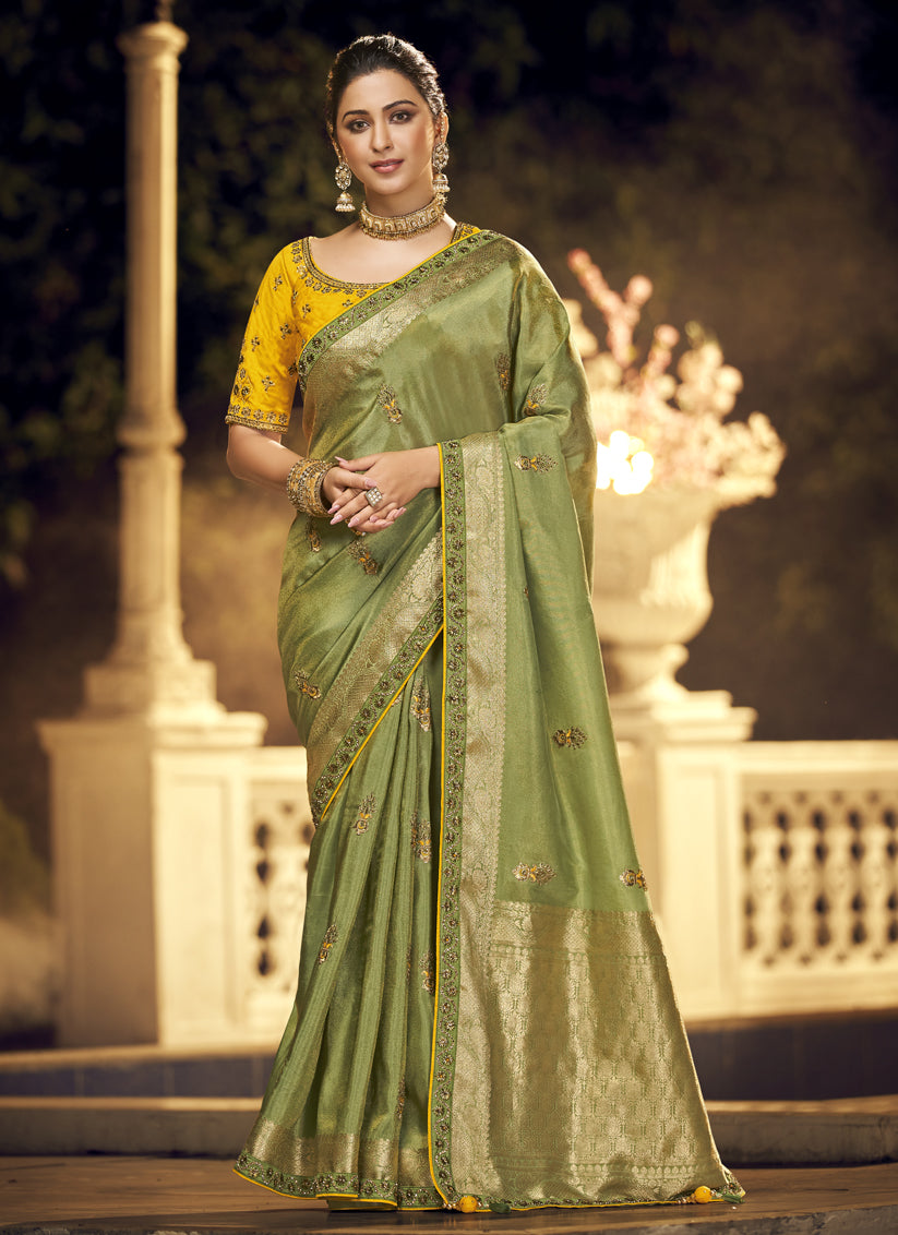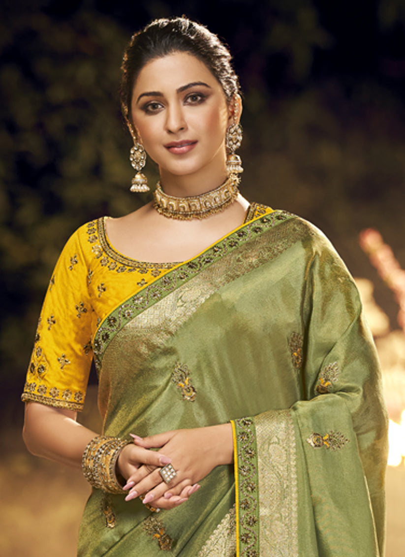 Work: Weaving and embroidery on saree with embroidery work on blouse