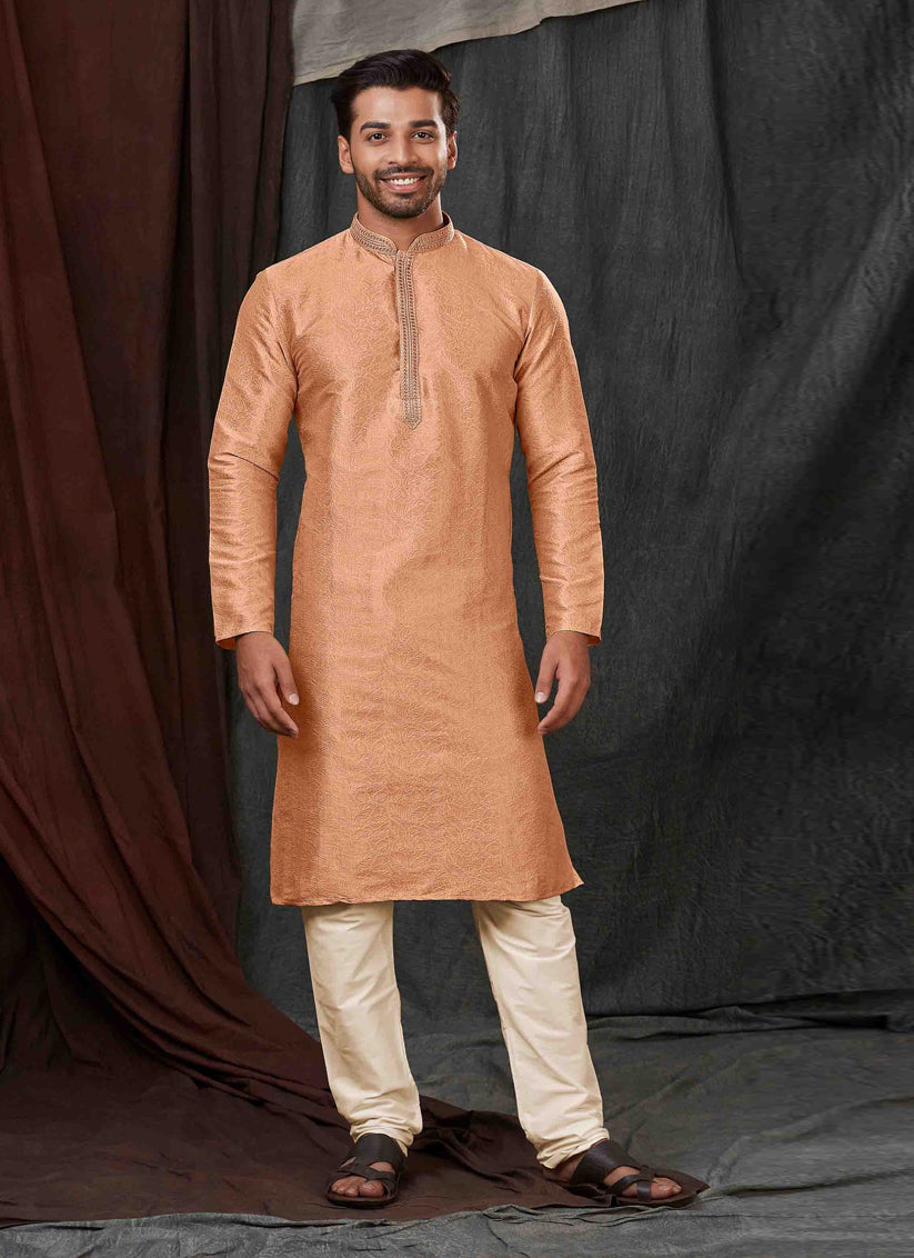 Salmon Orange Jacquard Mens Kurta Pajama Set