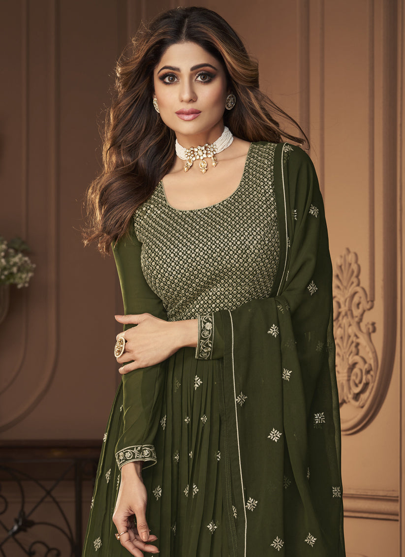Shamita Shetty Mehendi Green Georgette Embroidered Ready Made Sarara Kameez