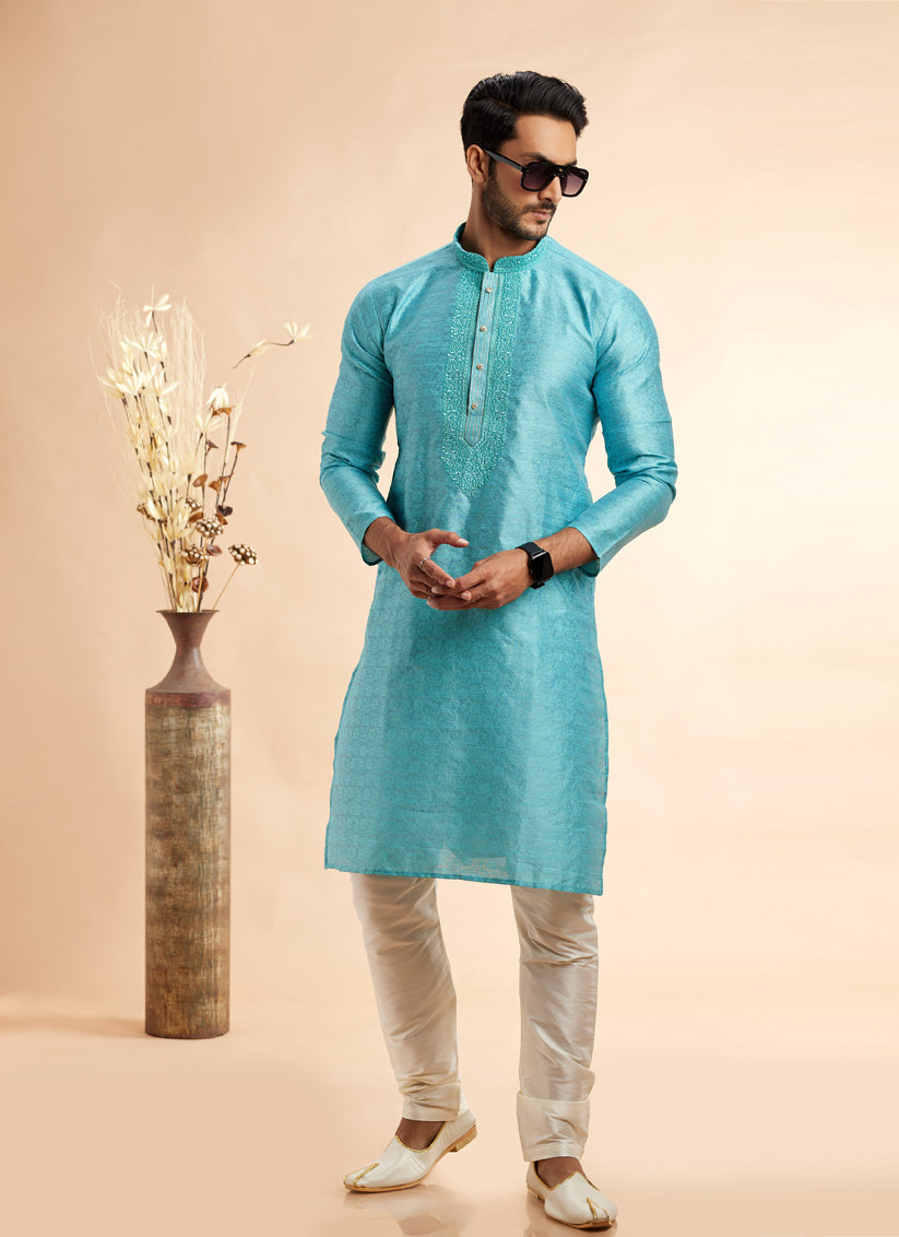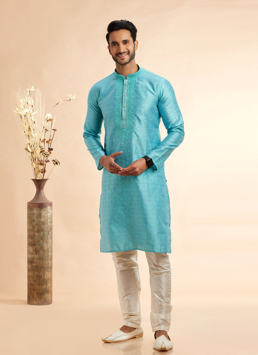 Sky Blue Jacquard Art Silk Embroidered Kurta Pajama Set