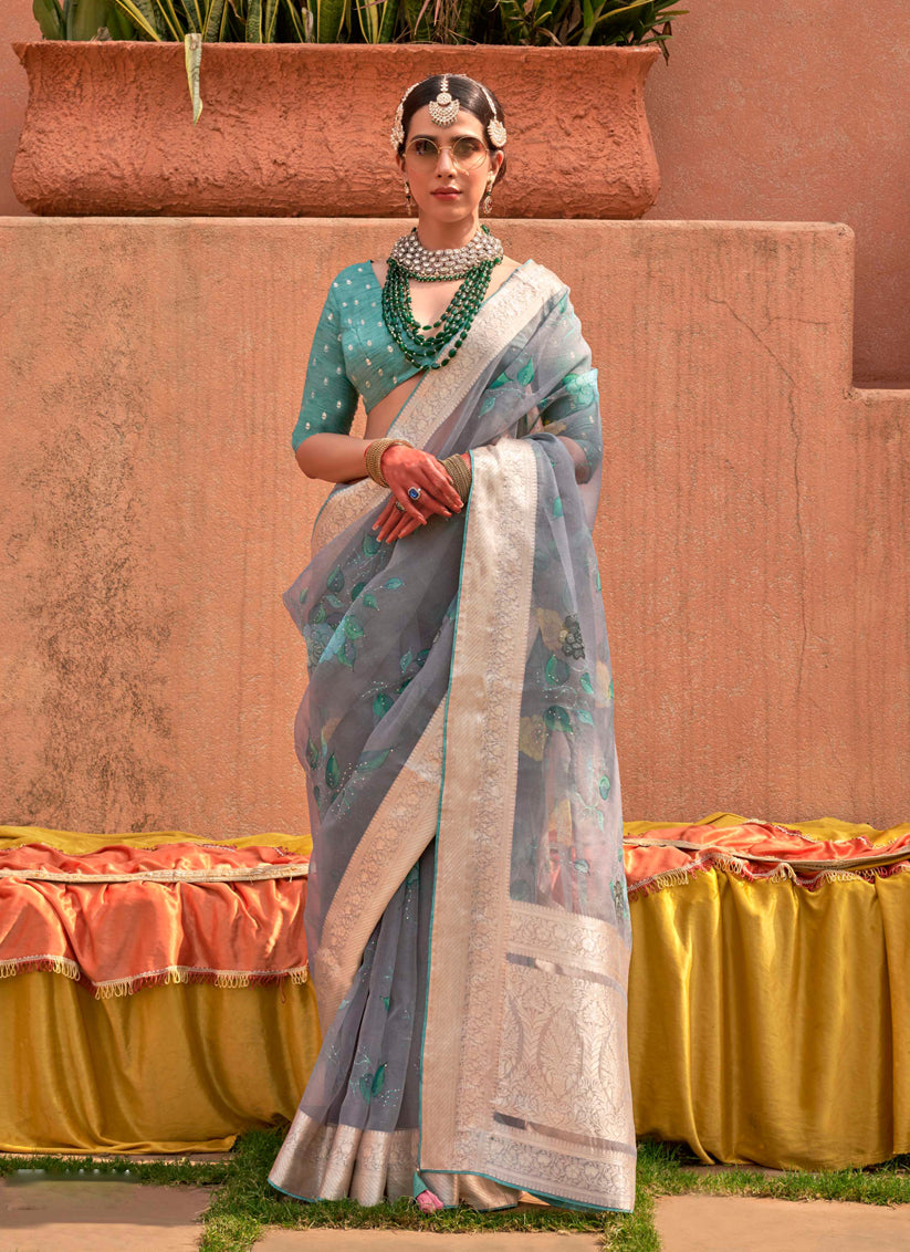 Smoke Grey Organza Silk Embellished Floral Print Saree