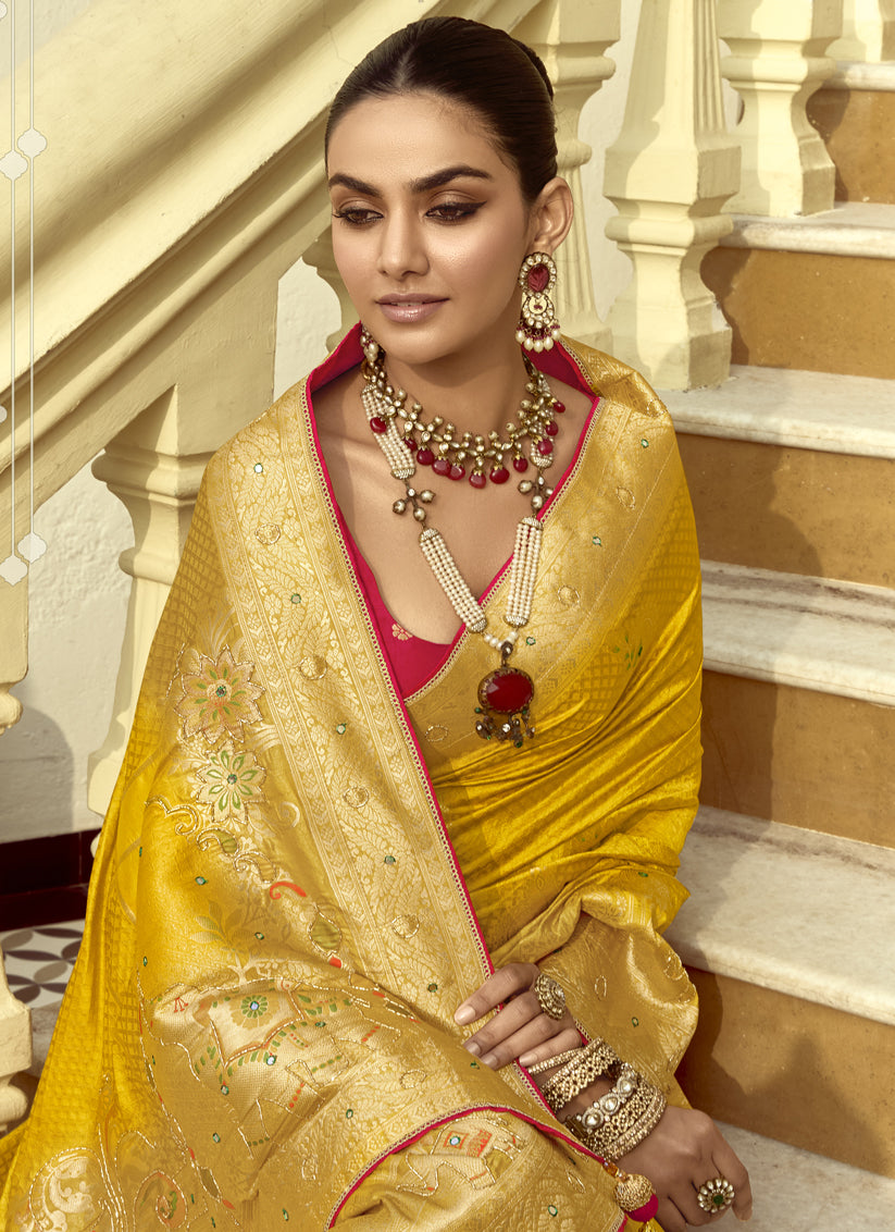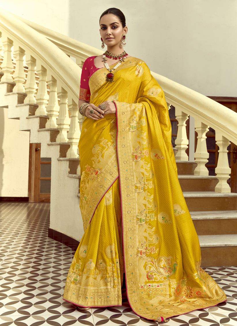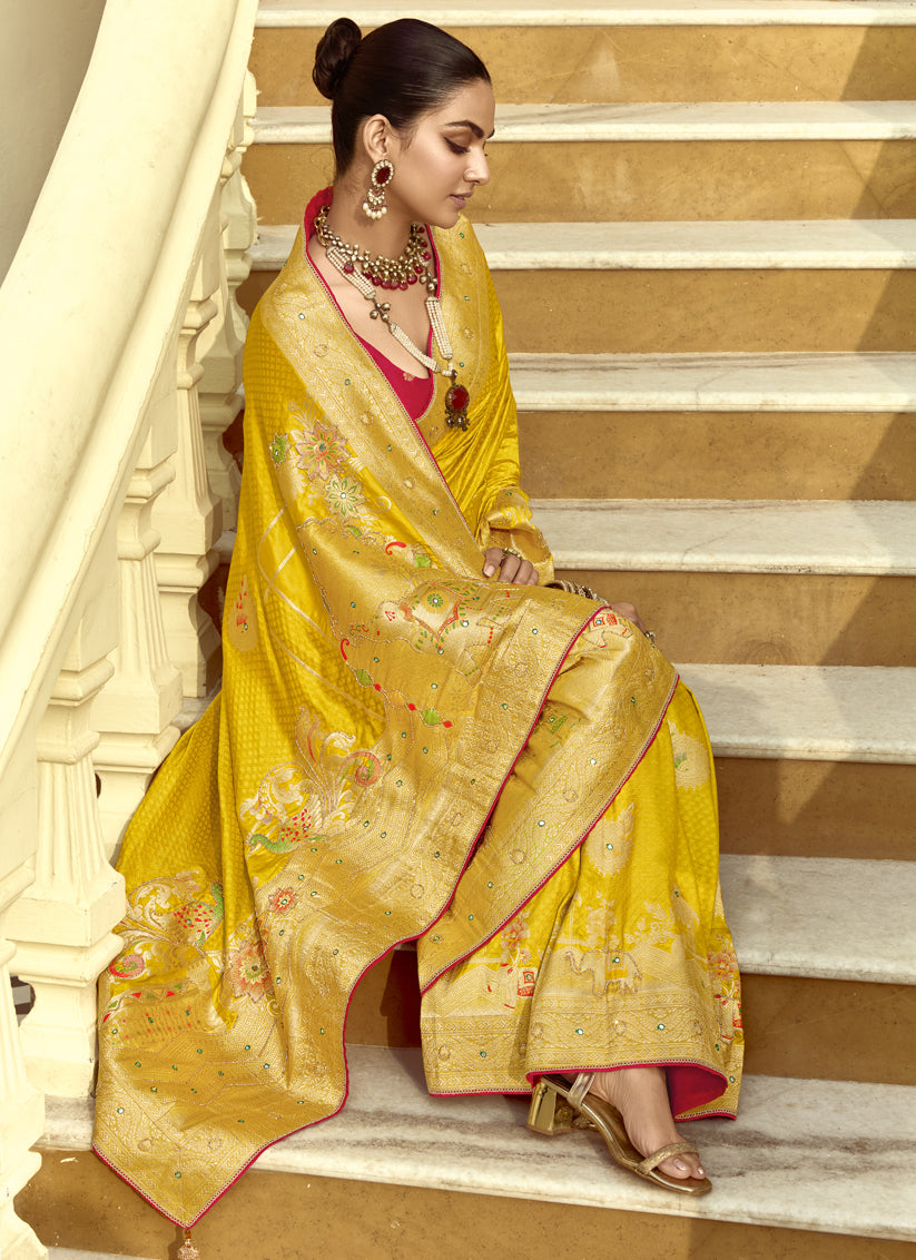 Sunny Yellow Dola Silk Handwork Wedding Saree