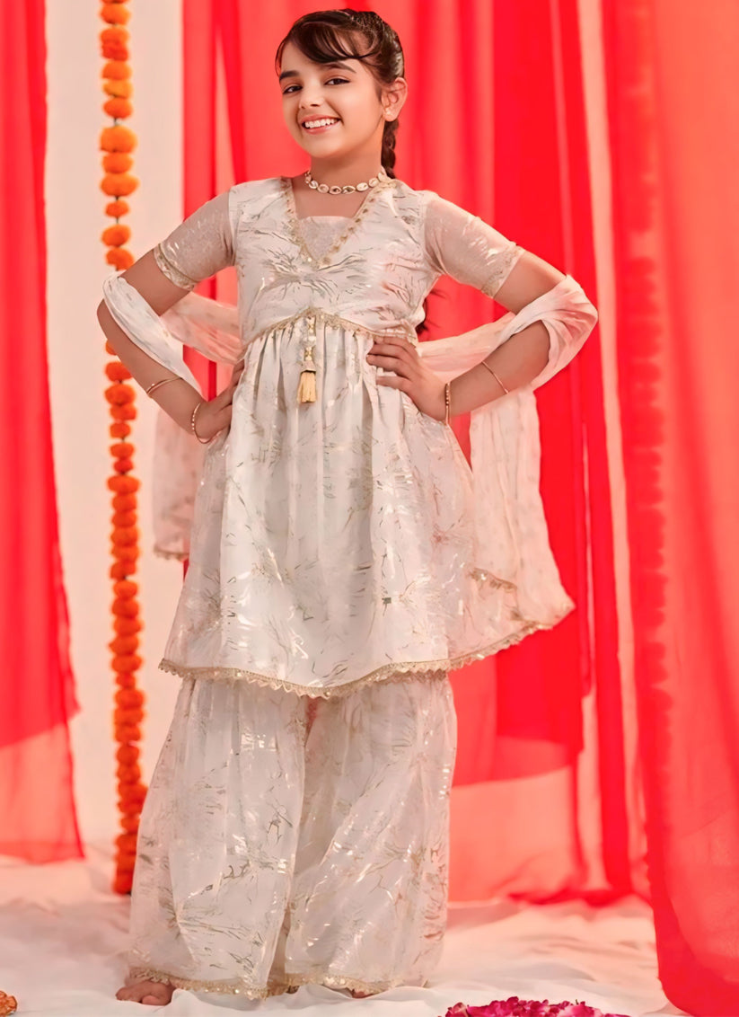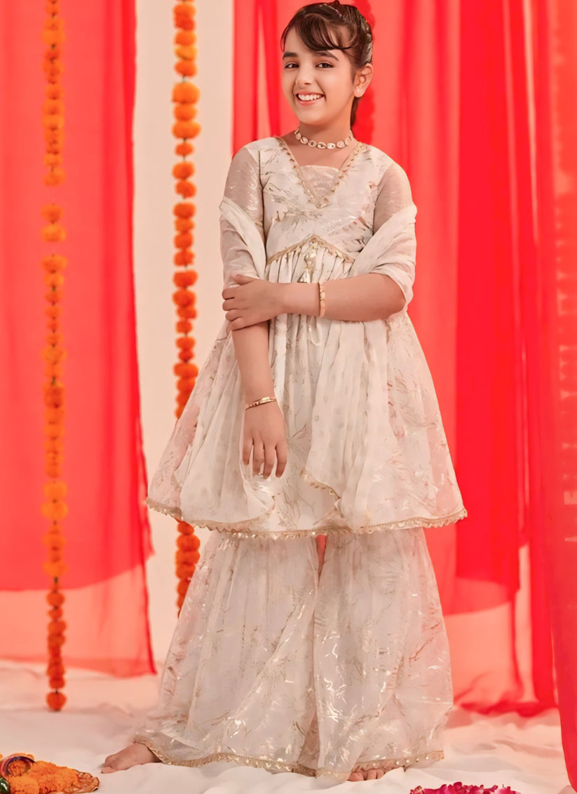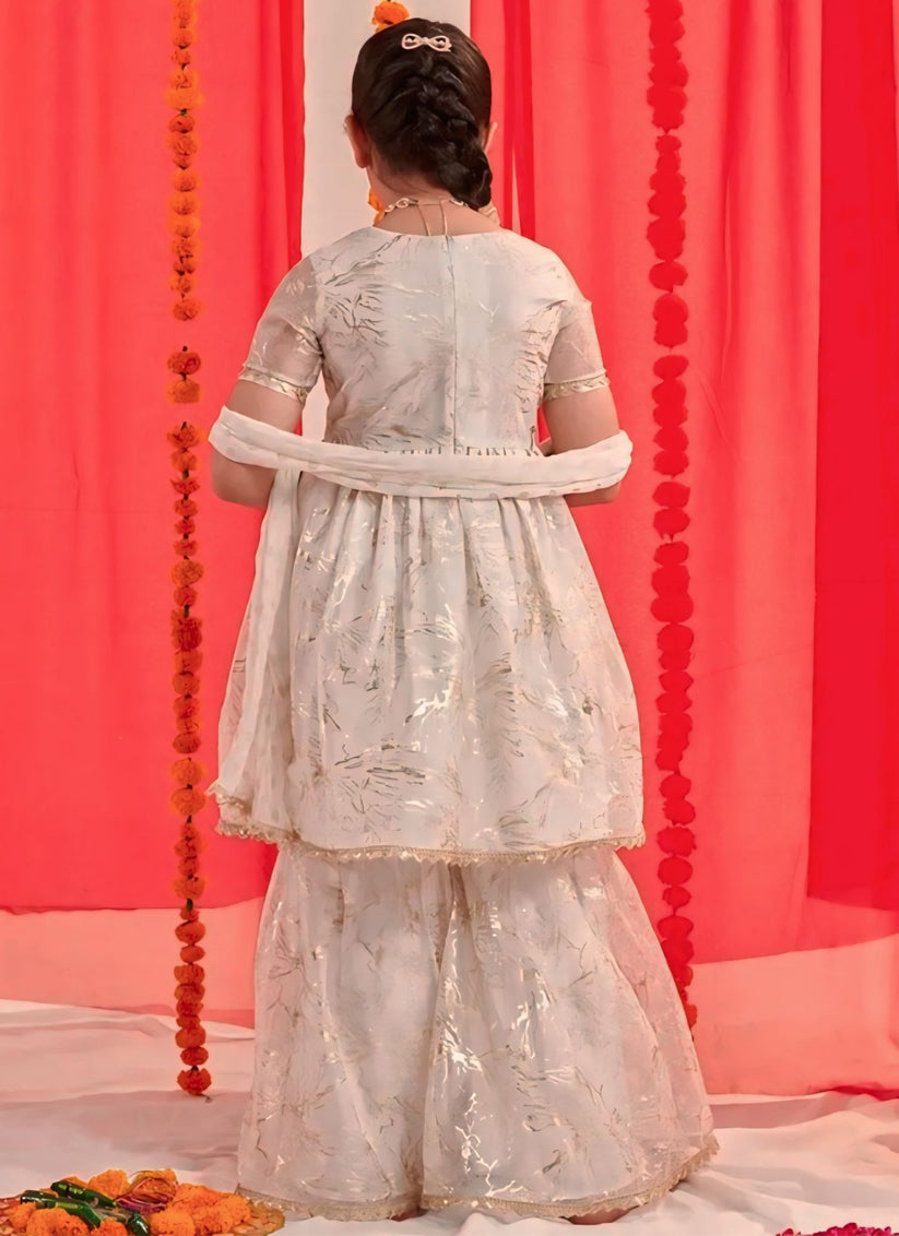 TDO252702-1White Foil Print Girls Kurta with Sharara and Duptta