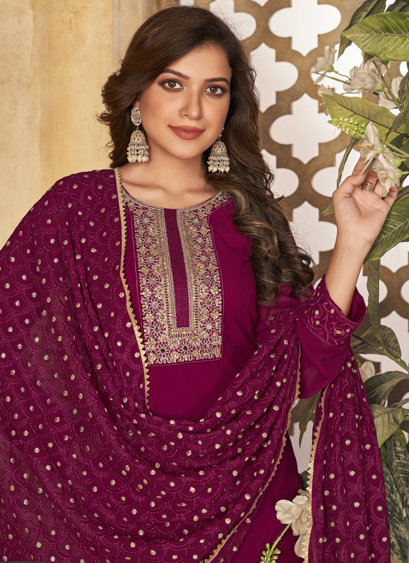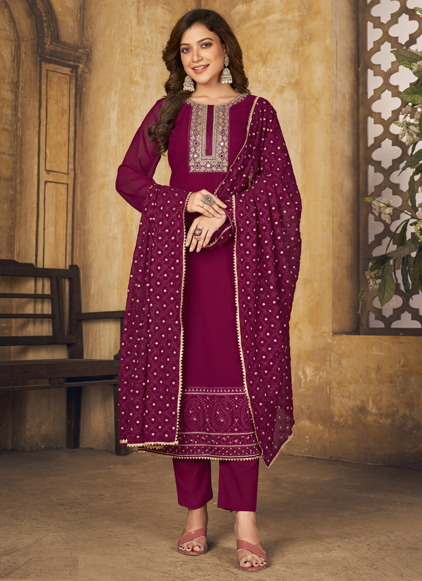 Wine Georgette Embroidered Ready Made Pant Kameez